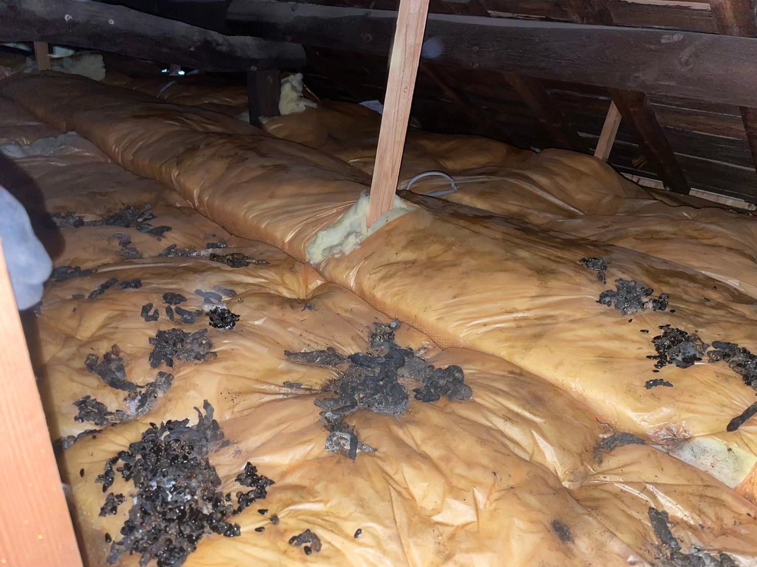 床下から1階・2階天井まで322㎡という非常に広範囲に被害が及んでおり、糞尿による汚染や断熱材の破損も確認される深刻な状態でした。