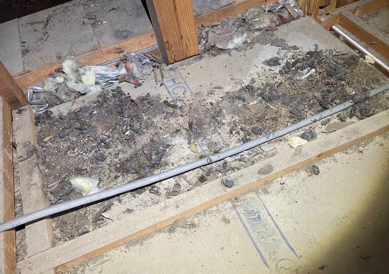 広い住宅全体にイタチの活動痕跡があり、糞尿による臭いも深刻な状態でした。