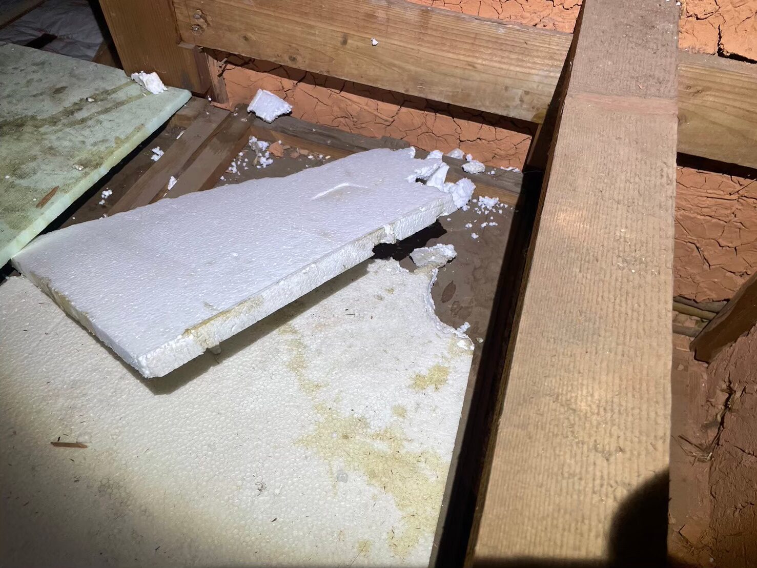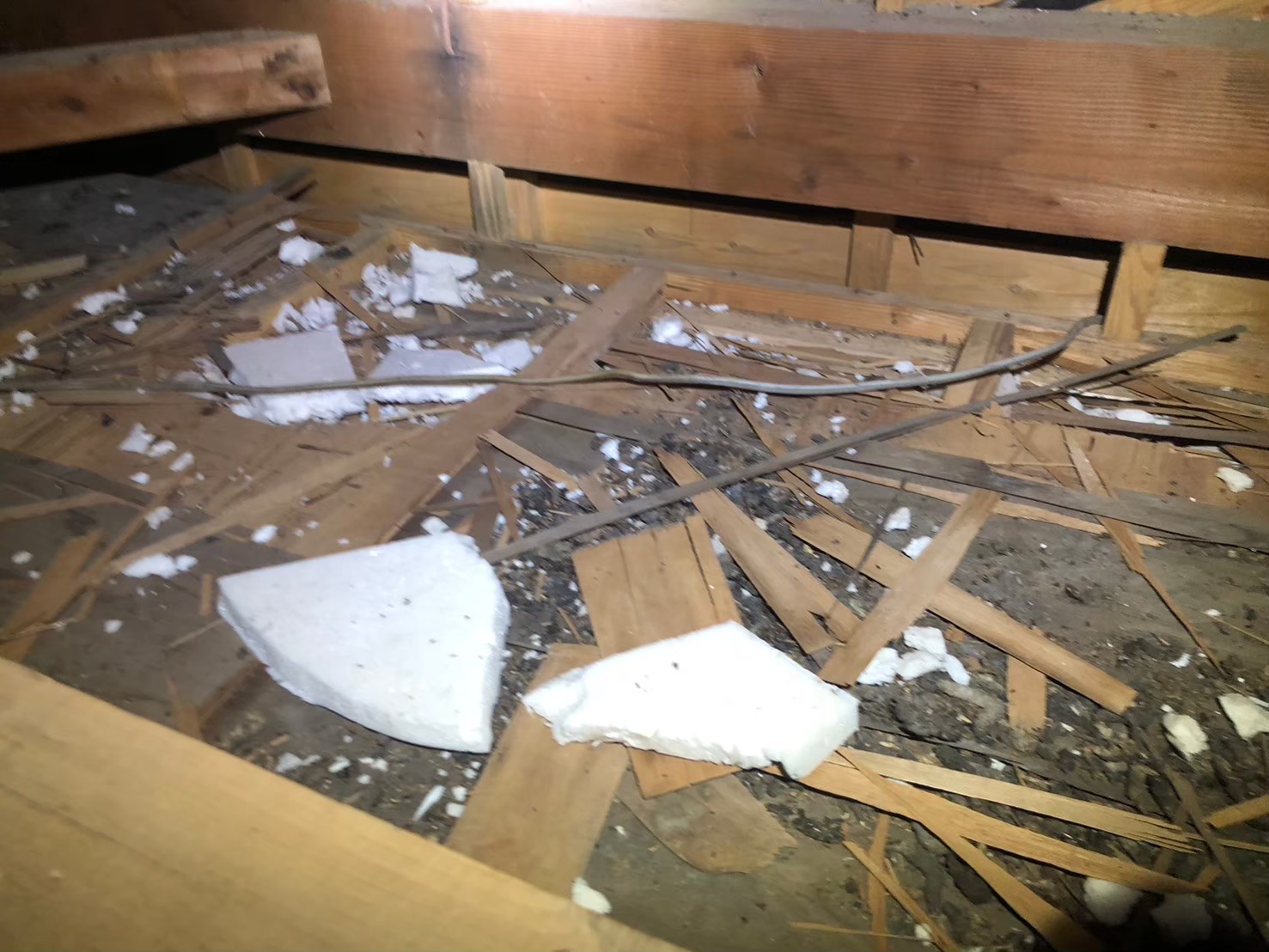ネズミにしては音が大きすぎると思い、屋根裏を覗いてみたところ、大きな糞が散乱していました。