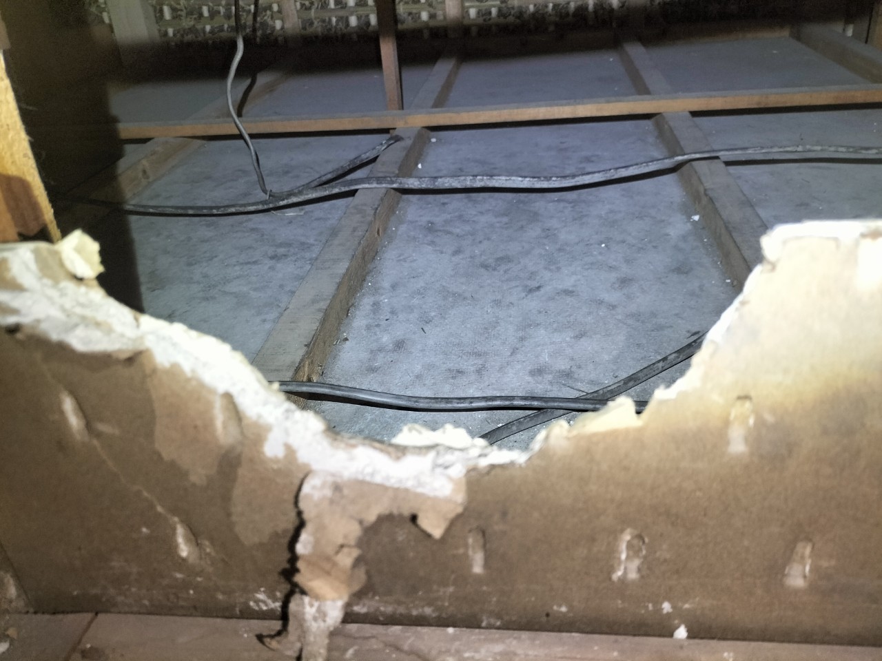 実際に確認すると、床下から2階天井まで263㎡という広範囲に被害が及んでおり、断熱材も相当荒らされた状態でした。