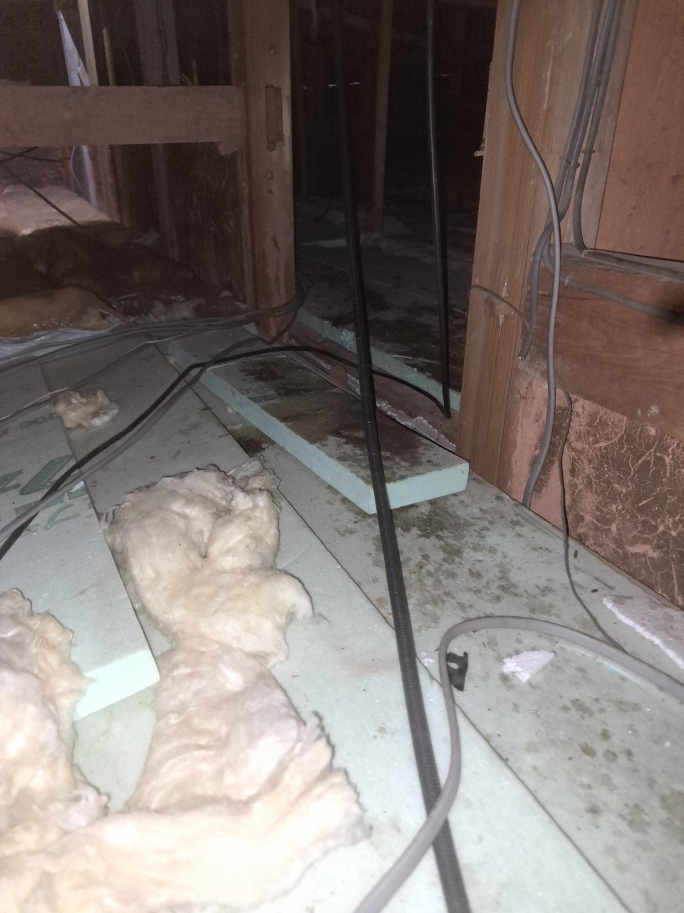 長期間住み着いていたため断熱材の被害が深刻で、40㎡の撤去と130㎡の新設が必要でした。