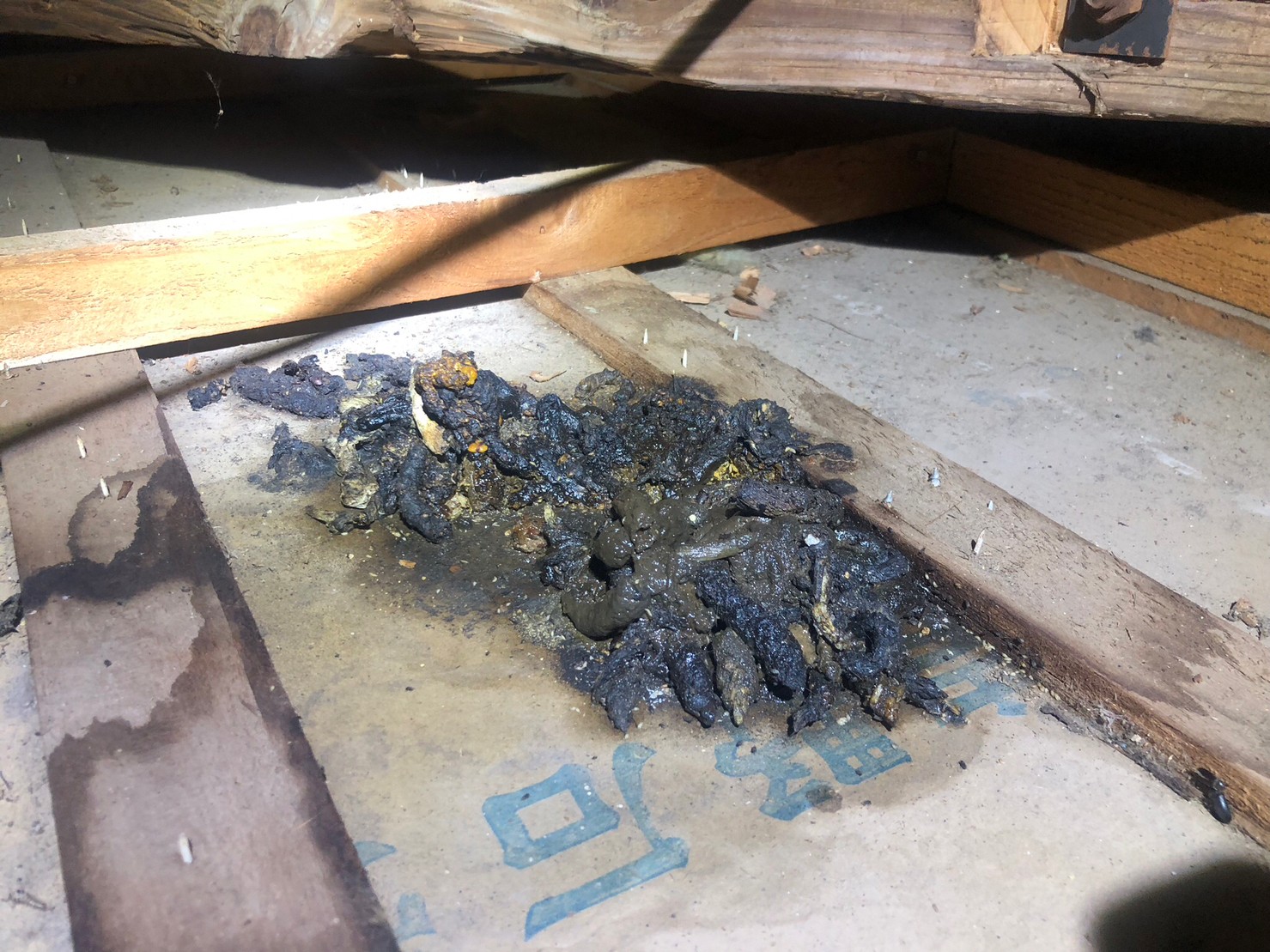 - 「夜中に天井裏でバタバタと走り回る音がひどく、最近では天井板がたわんでシミも広がり、部屋中に強烈な獣臭が充満しています」とのご相談でした。