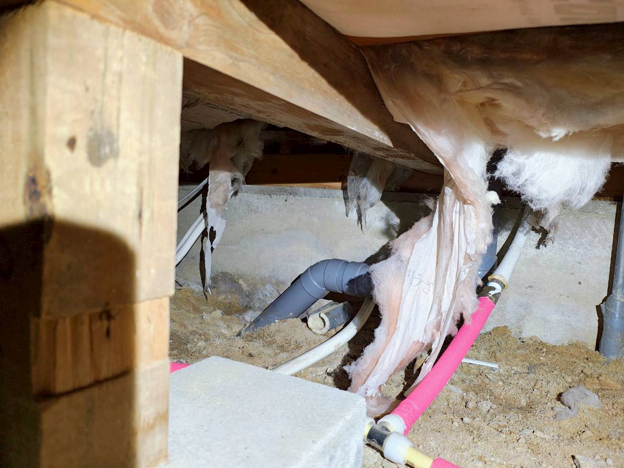 スタッフより - 今回の現場は床下から2階天井裏まで148㎡にわたってイタチの被害が確認され、死骸回収も必要な案件でした。