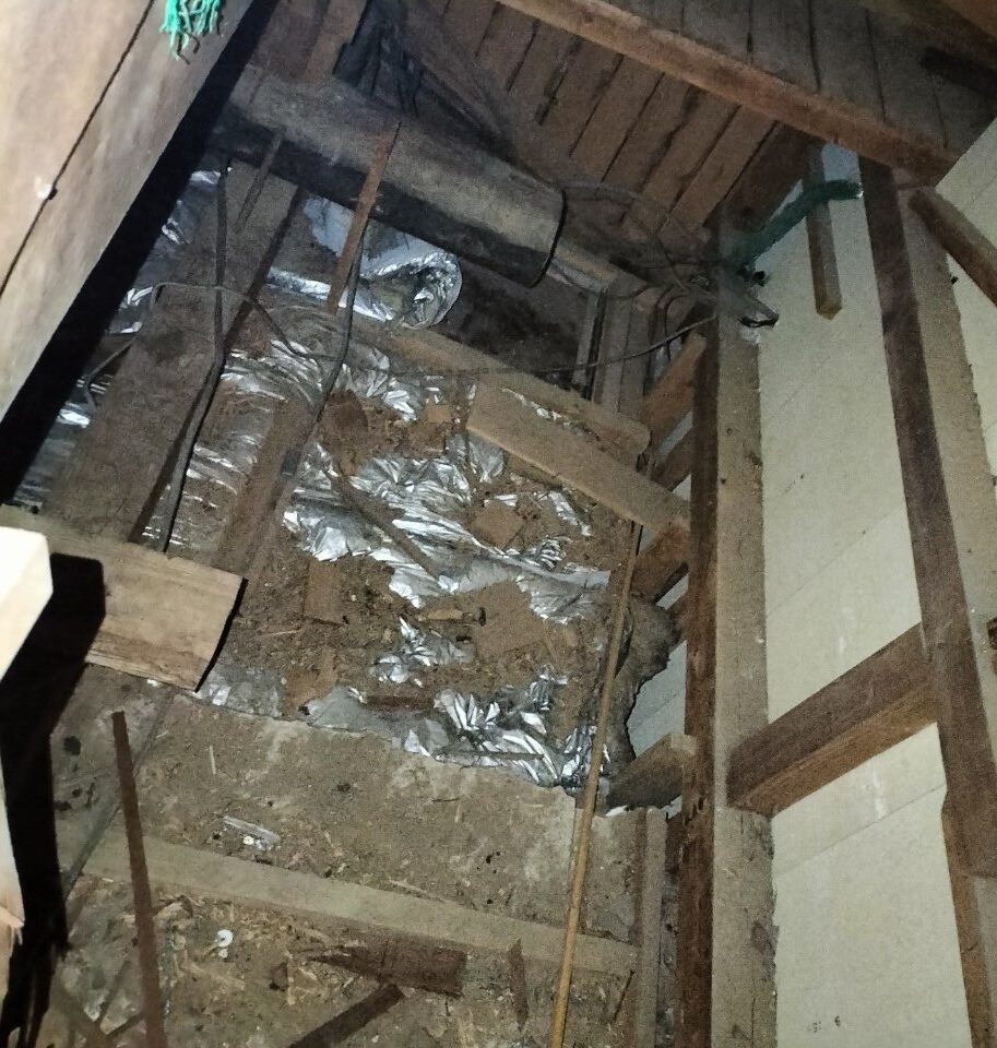 スタッフより - 236㎡に及ぶ広範囲のイタチ被害で、特に断熱材への汚染が深刻でした。