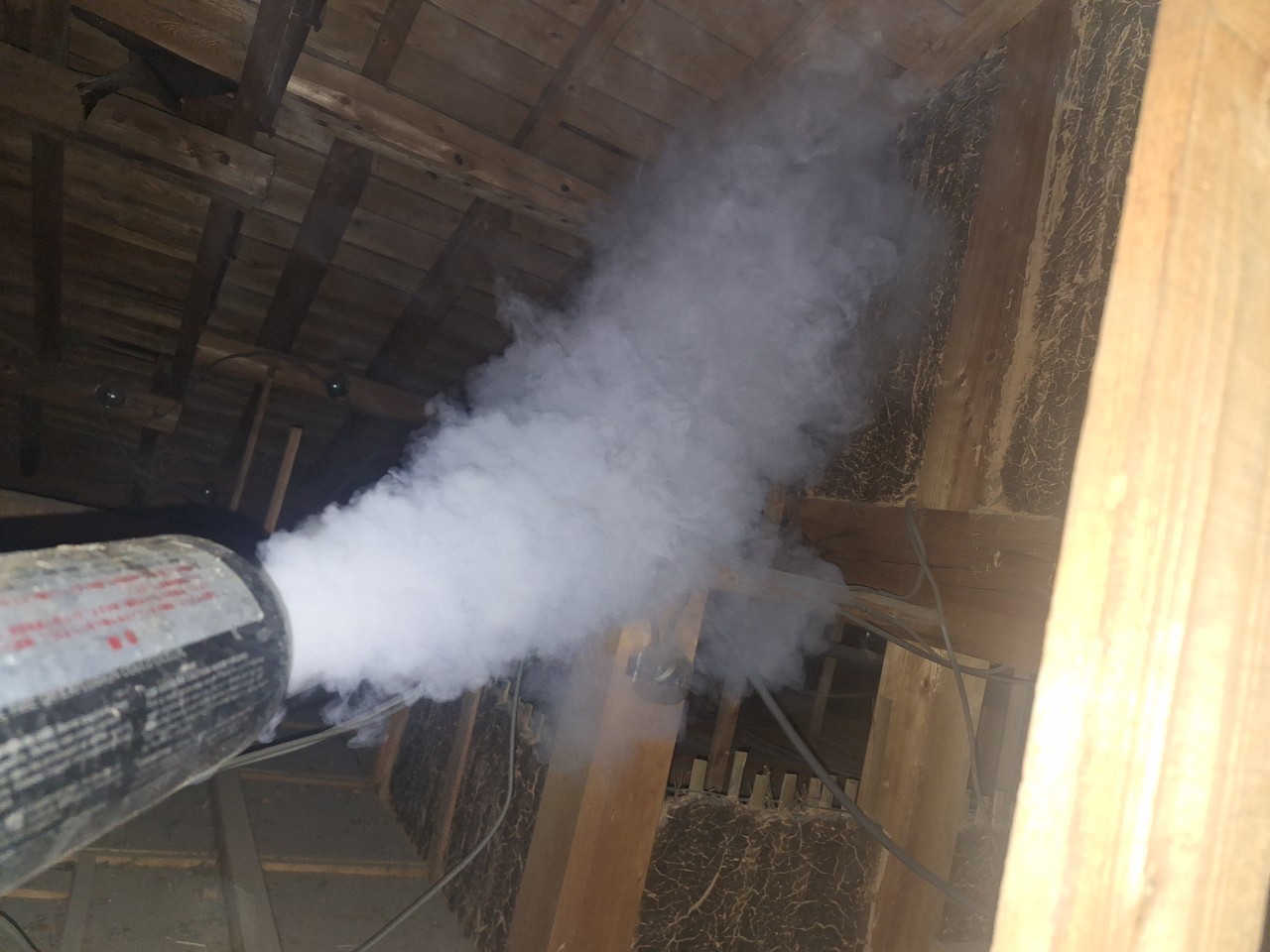 高所を含むすべての侵入口を完全封鎖し、224㎡全域にウイルス殺菌剤・消臭剤・ノミダニ駆除剤・忌避バリア剤を徹底散布しました。