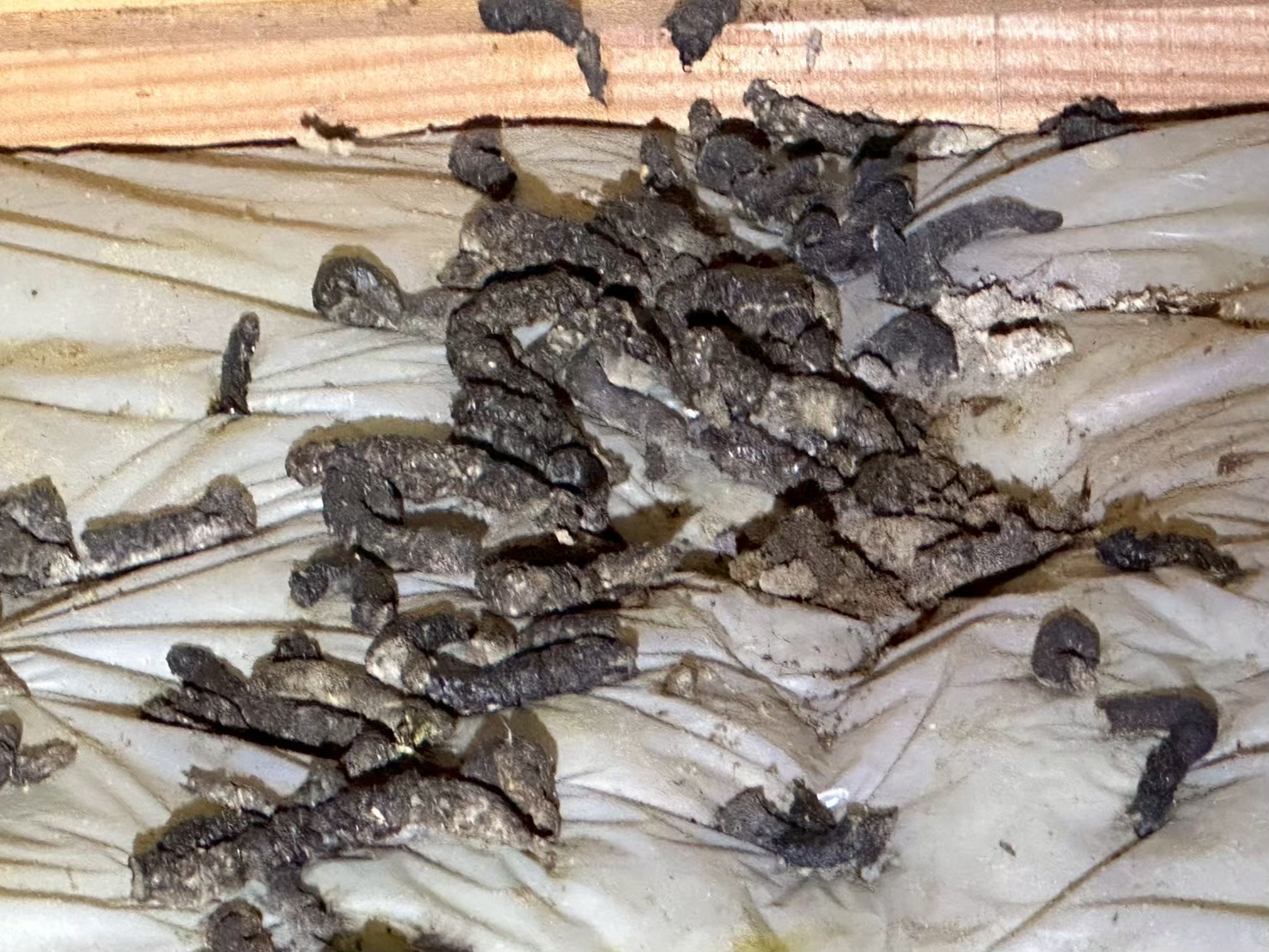 現地調査の結果、2階天井裏にアライグマの糞尿被害を確認。大屋根と屋根の重なり部分から侵入していることが特定されました。