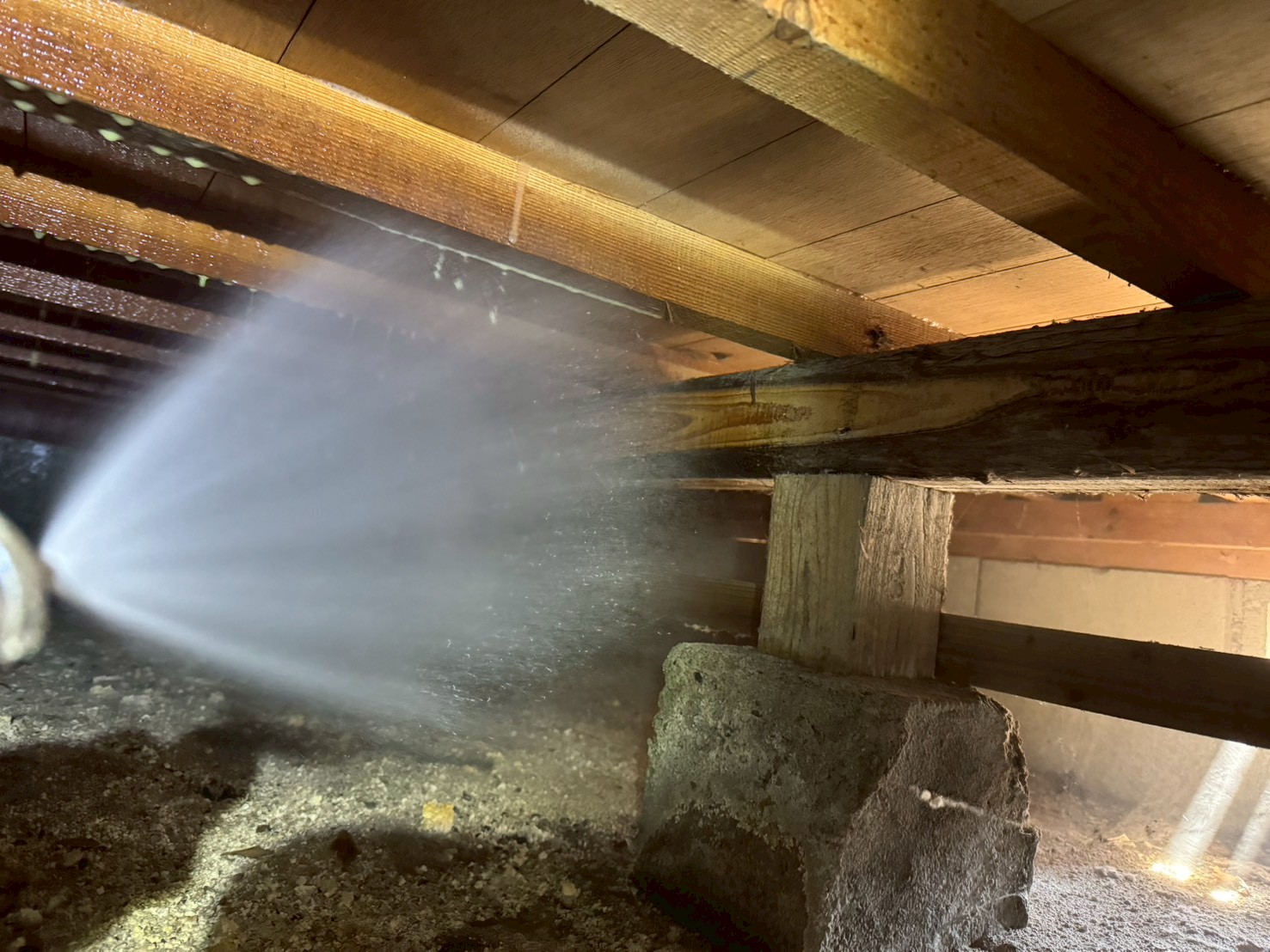 床下全域にシロアリ駆除・予防剤と防カビ剤を徹底散布し、木材への防腐処理と湿気対策も同時に実施。
