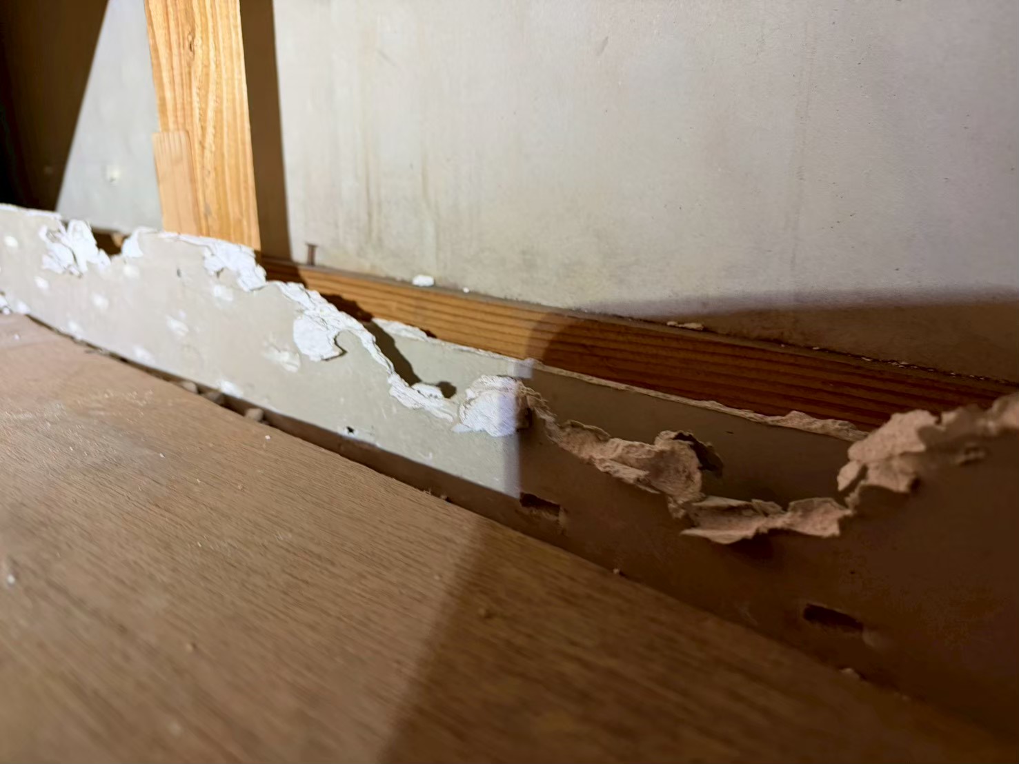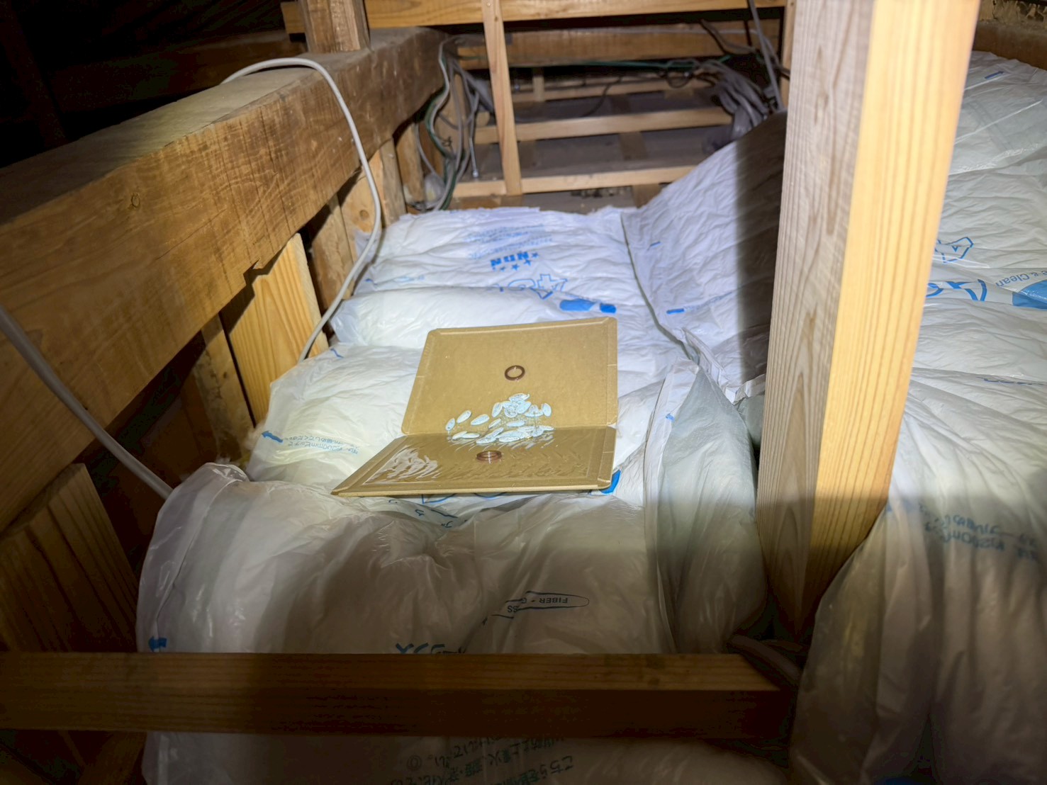 現地調査の結果、床下・天井上にわたりアライグマの侵入経路と大量の糞尿被害が確認され、LDK・通路上の断熱材26.84㎡が汚染されていました。