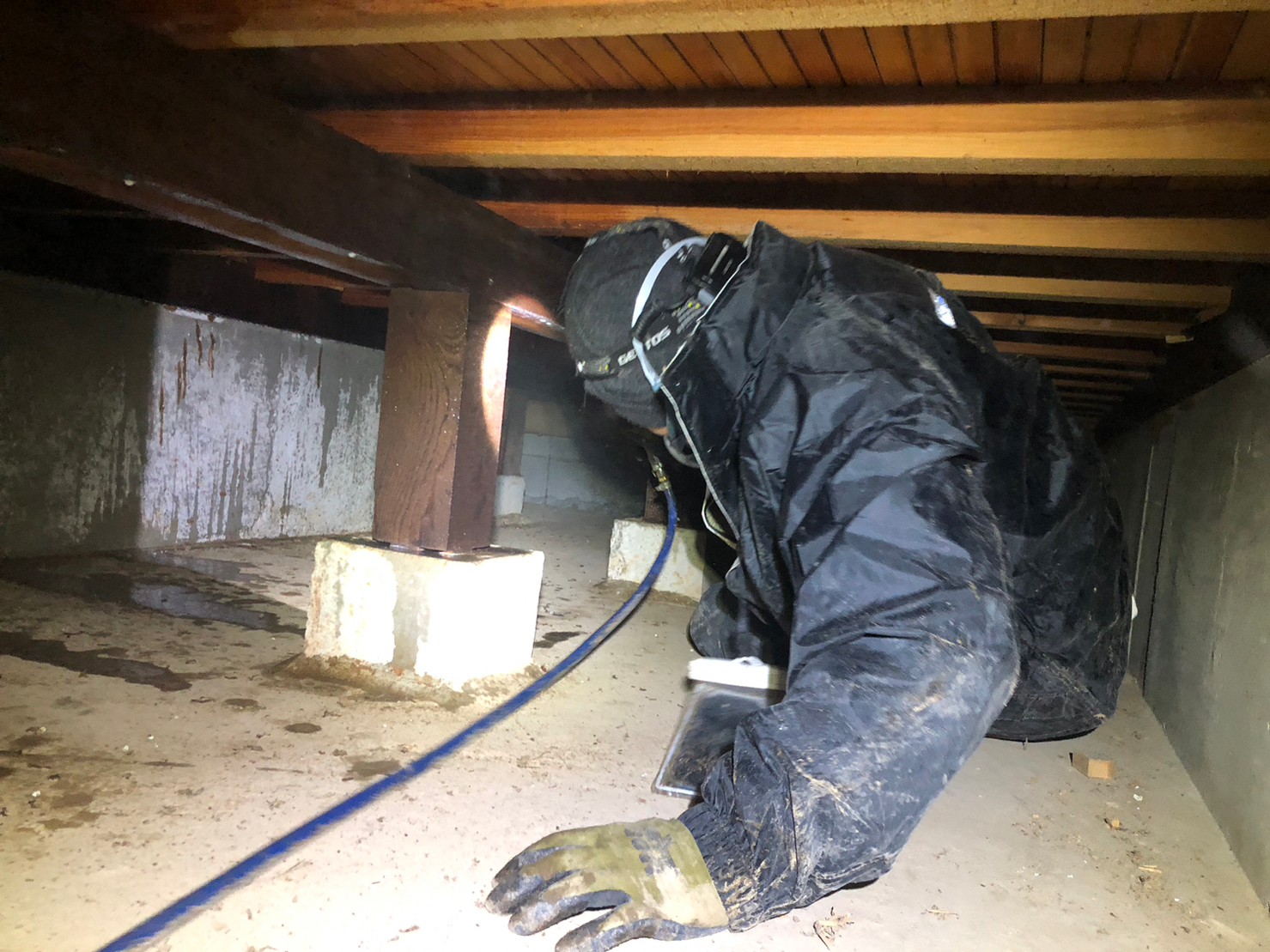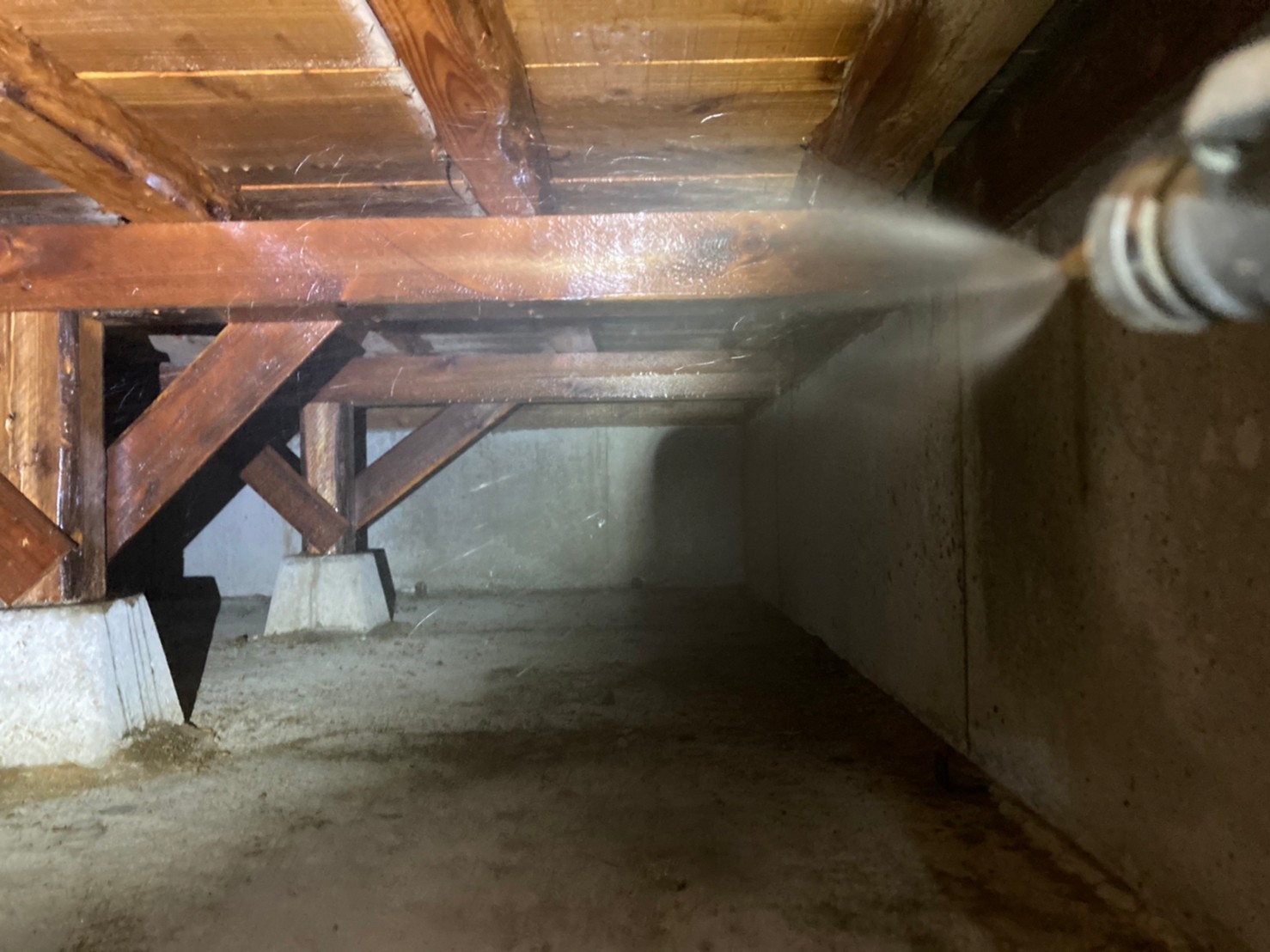 被害箇所に駆除剤を重点散布し、床下全域に予防薬剤・防カビ剤を徹底処理。