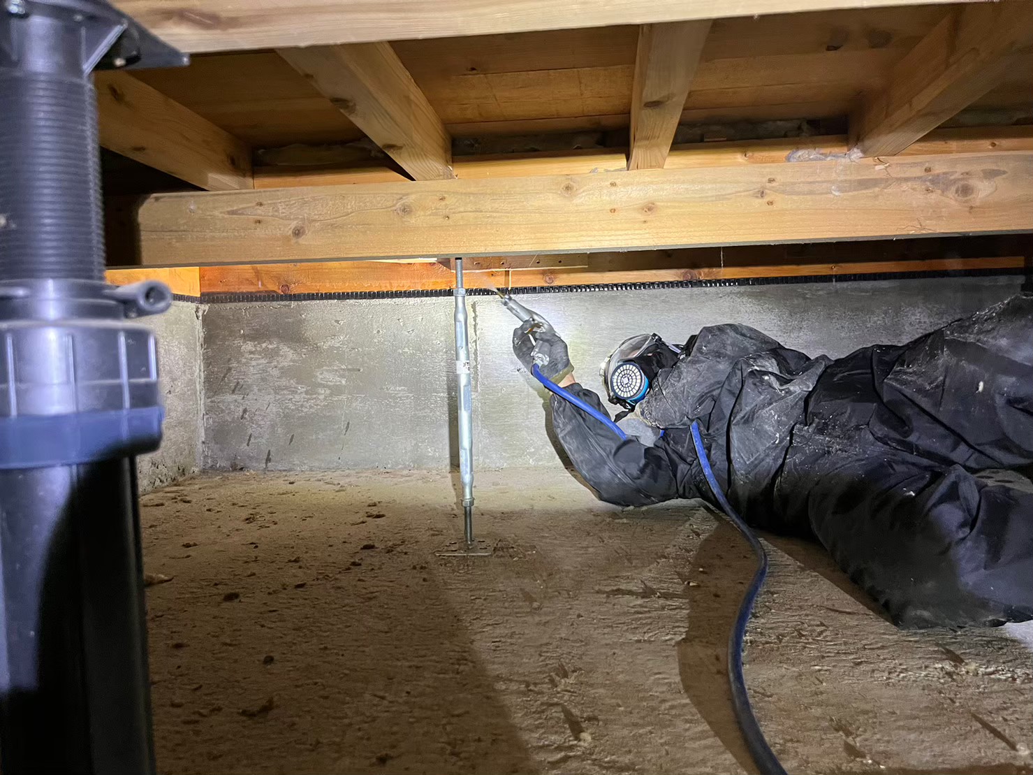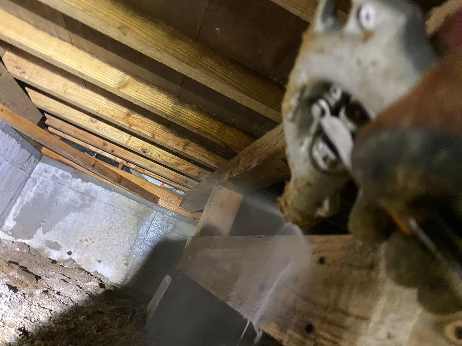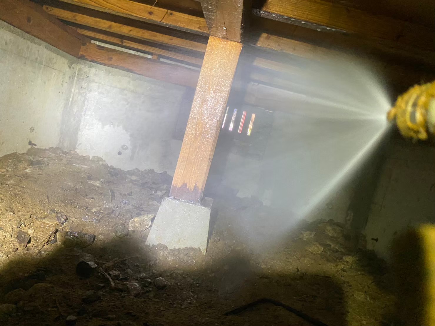 被害箇所に駆除剤を重点的に散布し、床下全域に予防薬剤・防カビ剤を徹底処理。