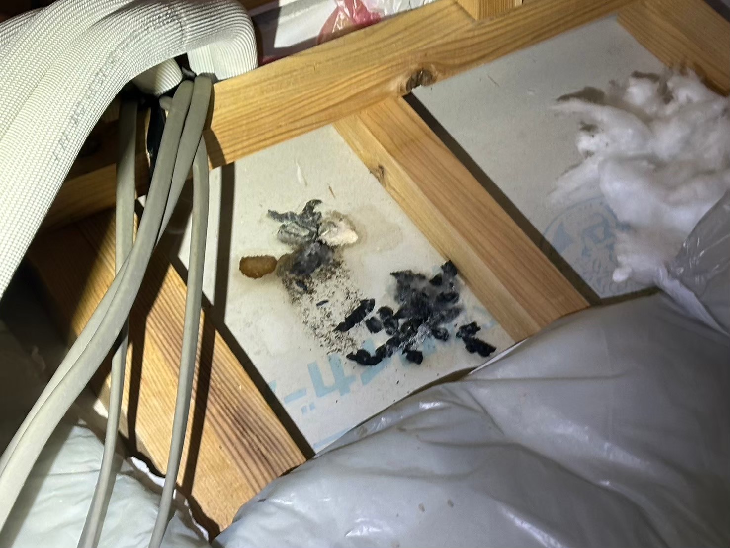 調査の結果、床下・1階天井裏の計104㎡にイタチの侵入痕跡と糞尿被害が確認されました。