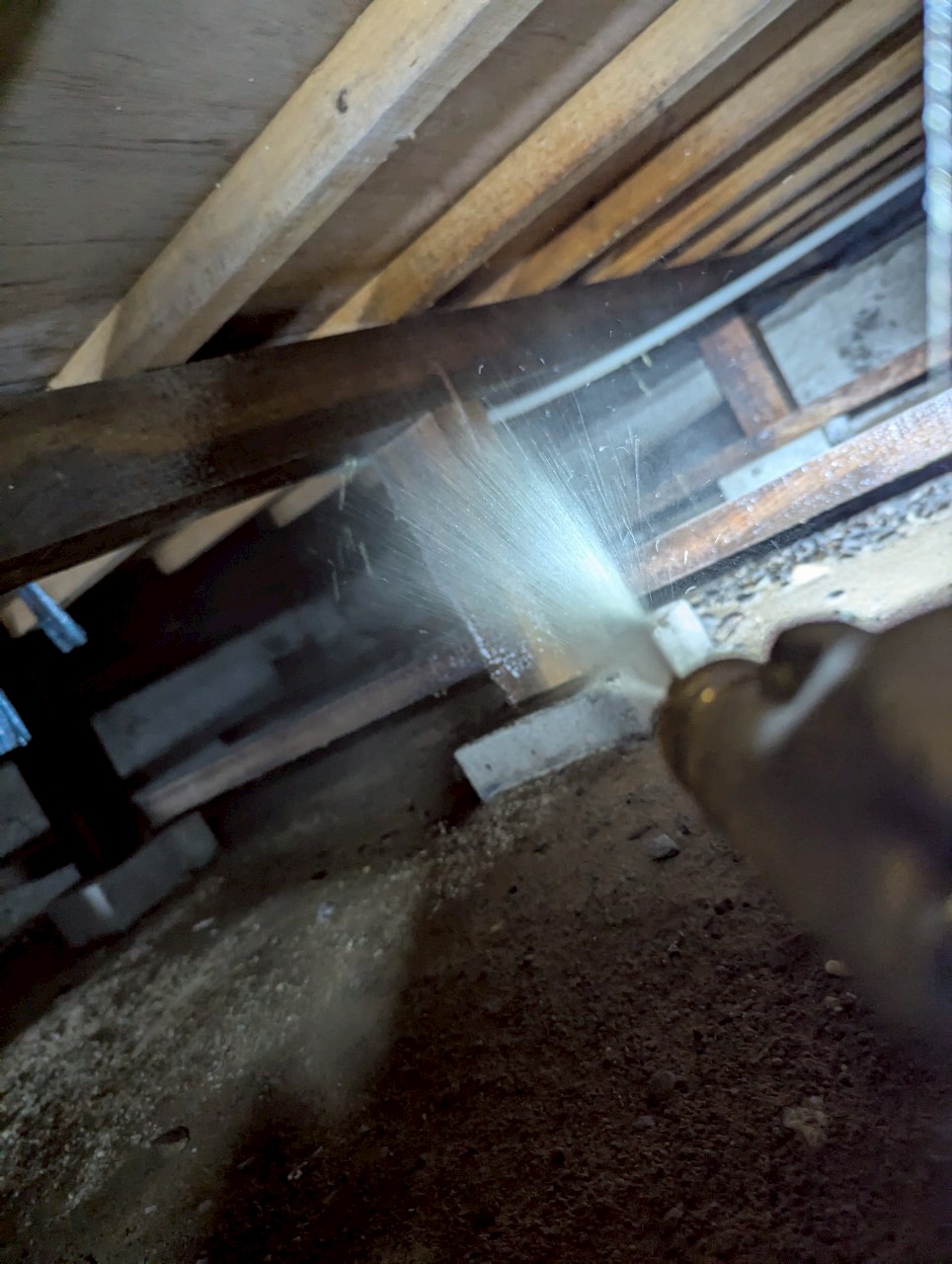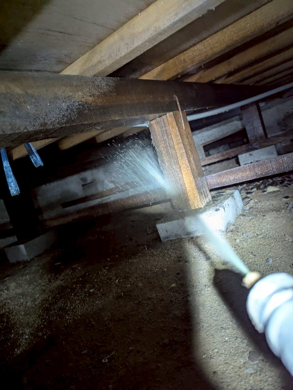 被害が進行した木材には穿孔注入で薬剤を深部まで浸透させ、床下全域に駆除剤・防カビ剤を徹底散布。