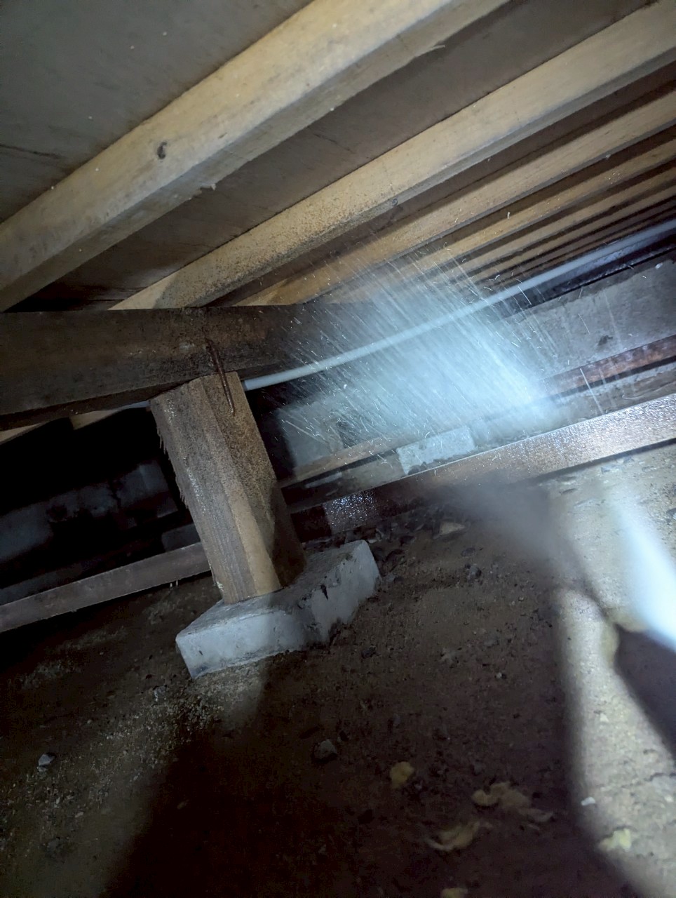 スタッフより - 床下調査で土台や根太に広範囲のシロアリ食害が確認されました。