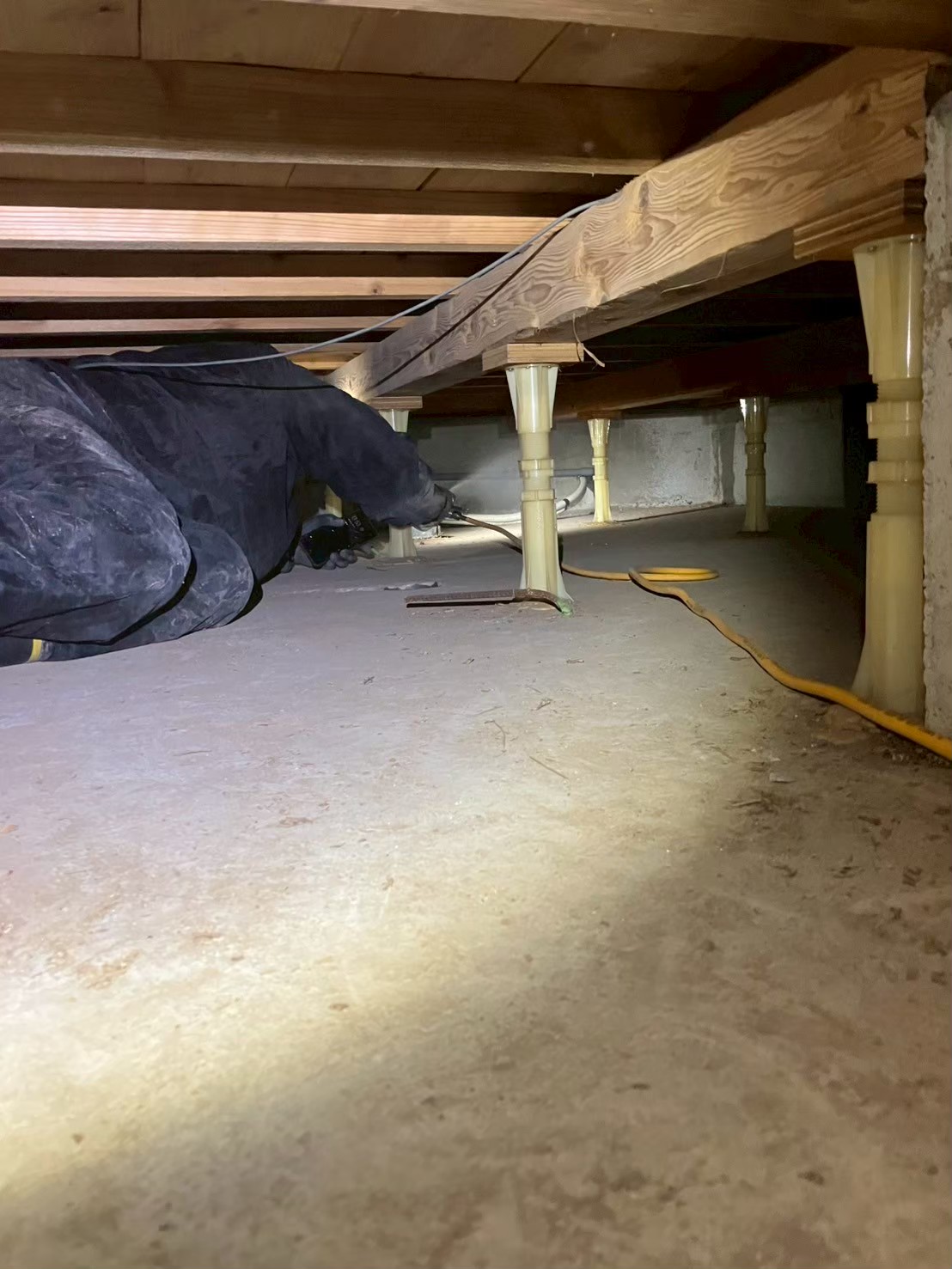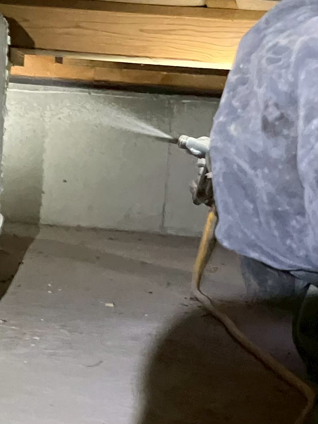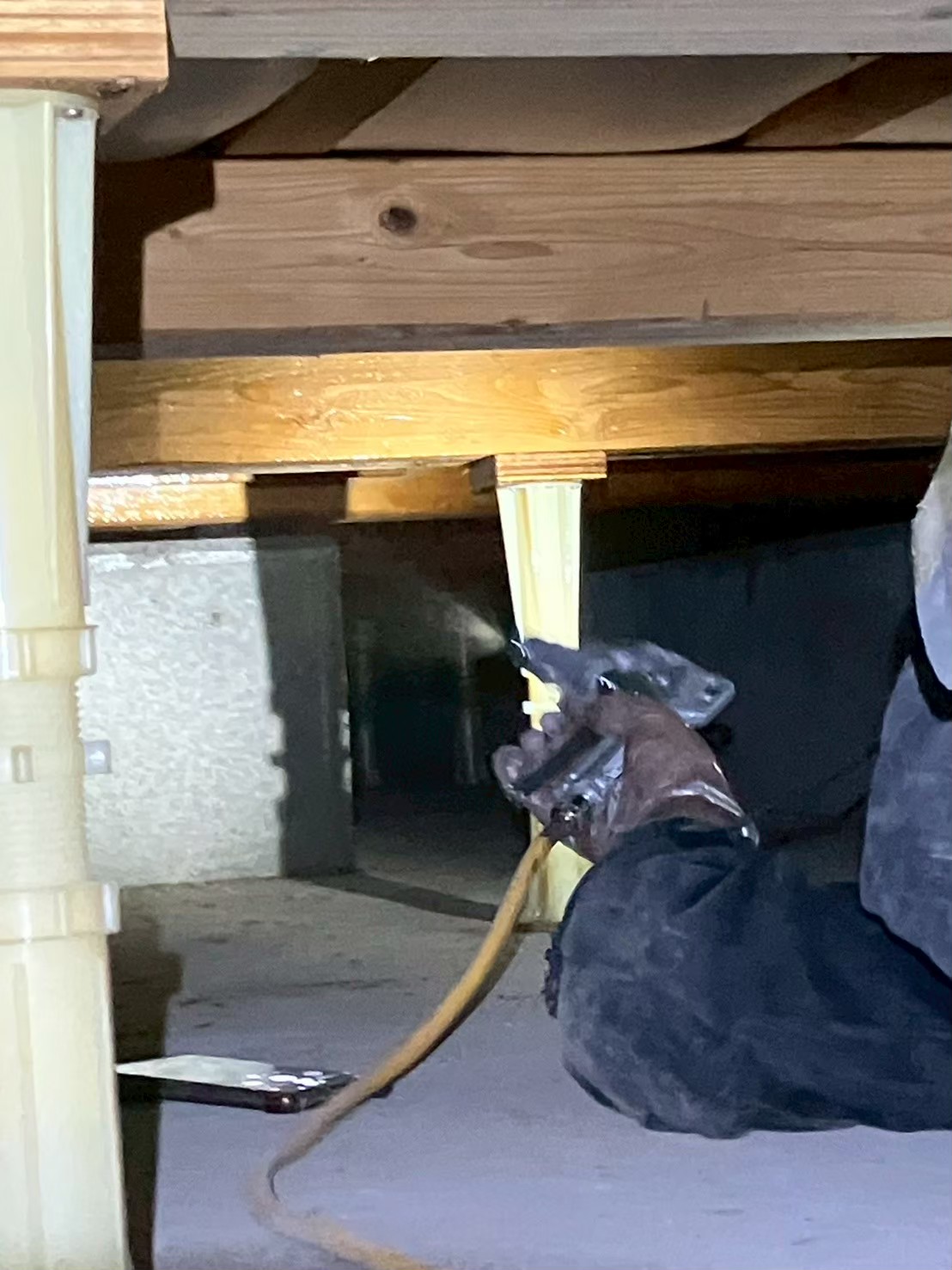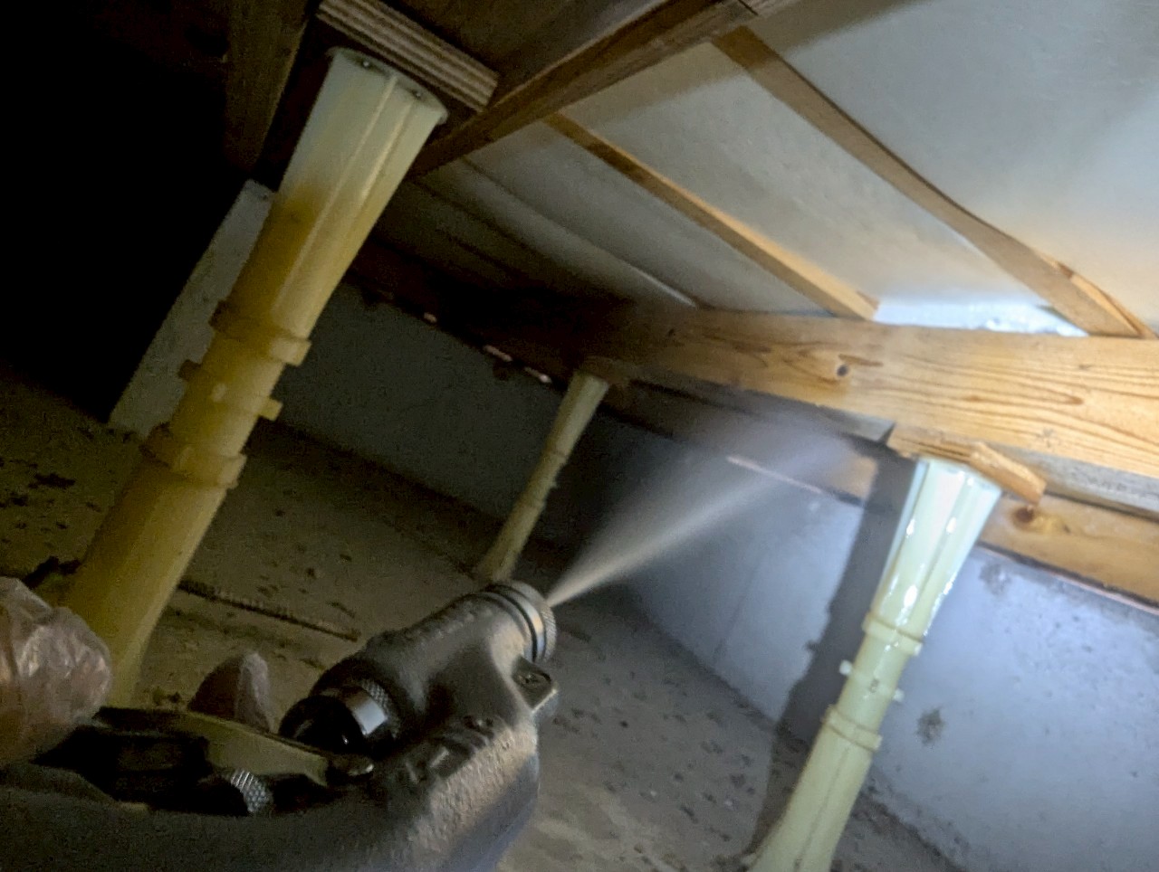 被害木材には穿孔注入で薬剤を内部まで浸透させ、床下全域に駆除剤・防カビ剤を徹底散布。