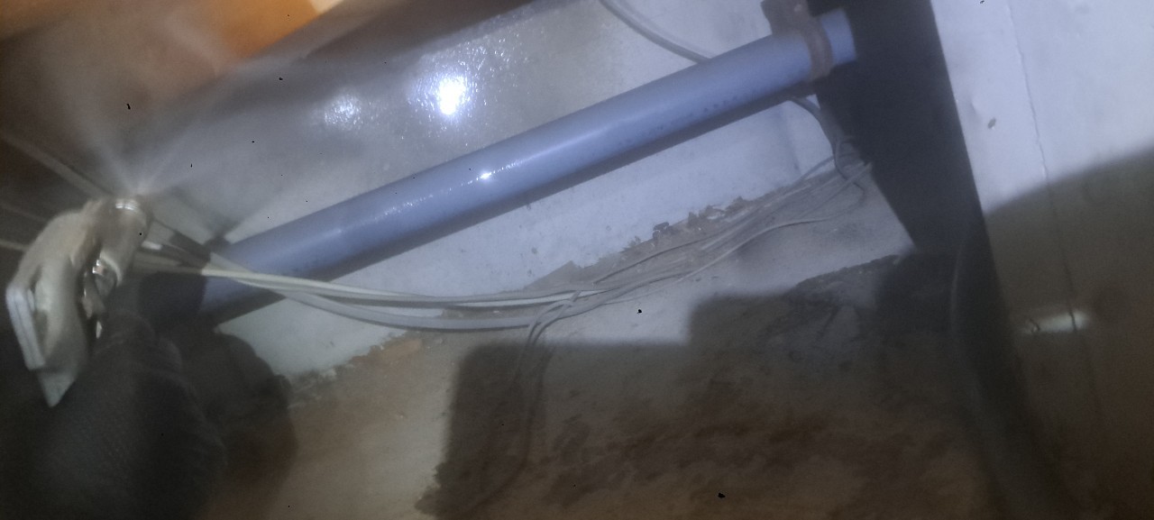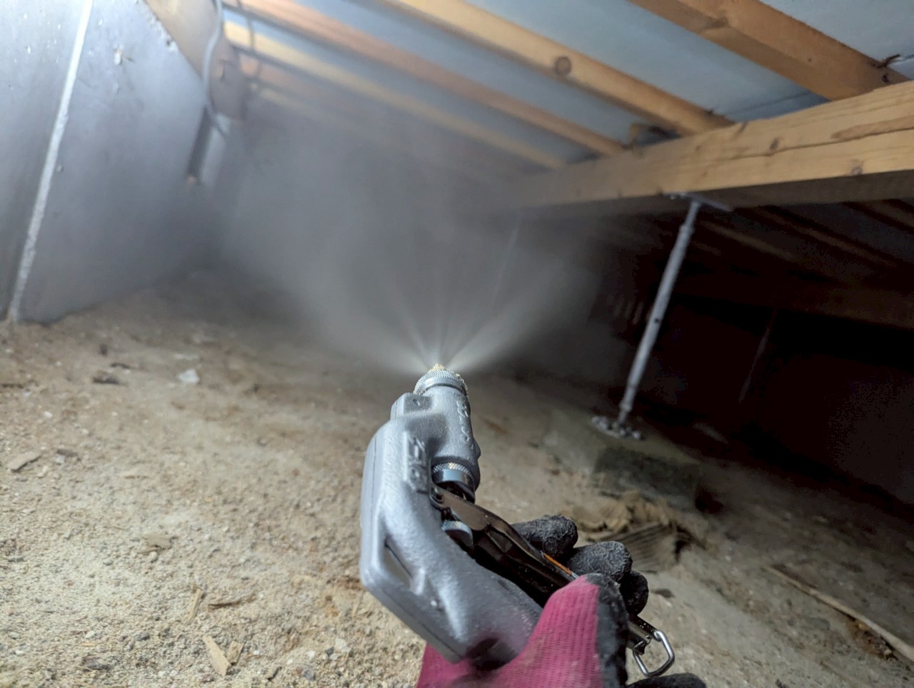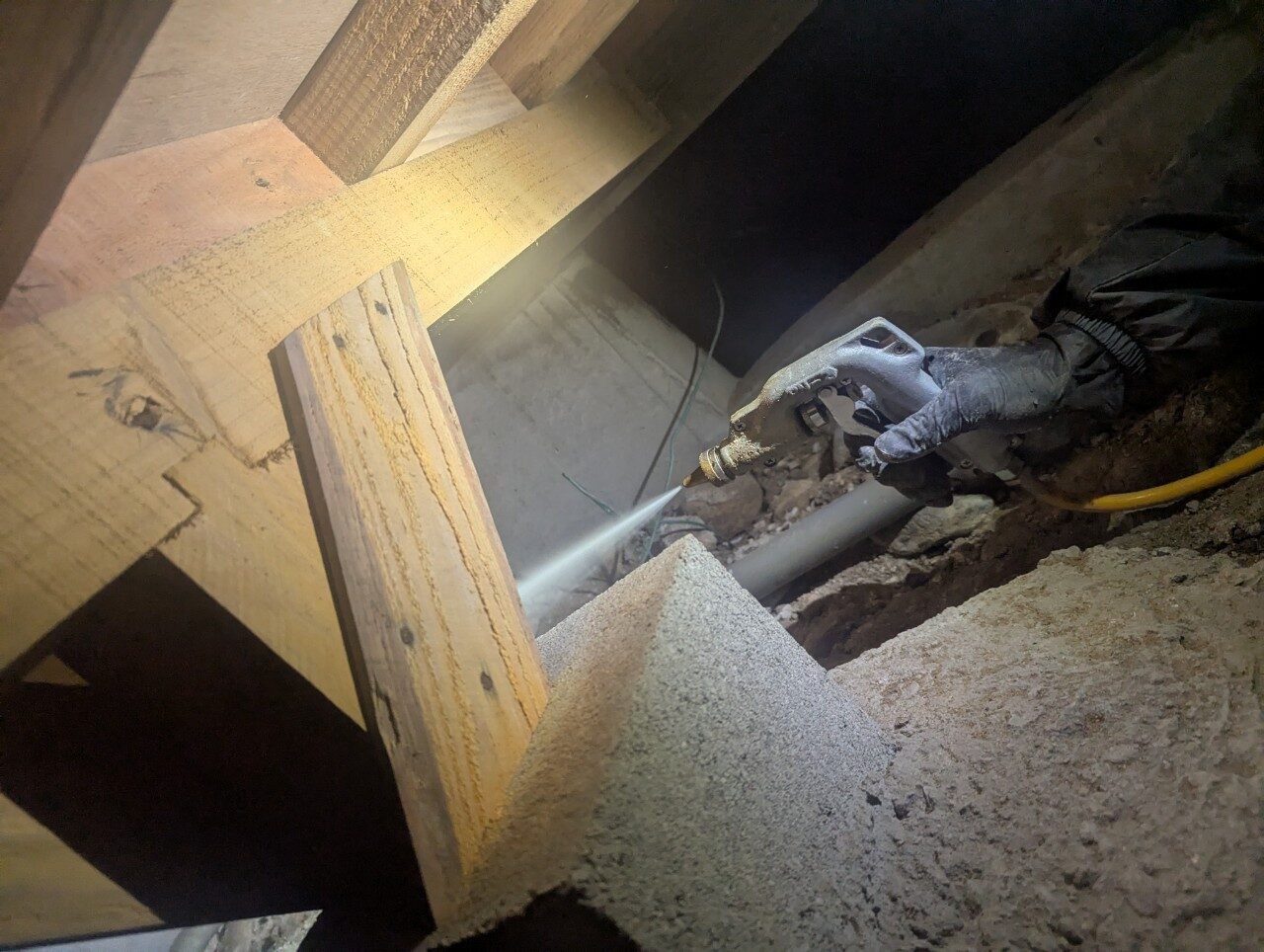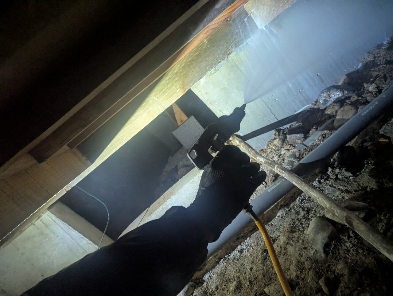 被害木材には穿孔注入で薬剤を奥まで届かせ、床下全域に駆除剤・防カビ剤を散布しました。