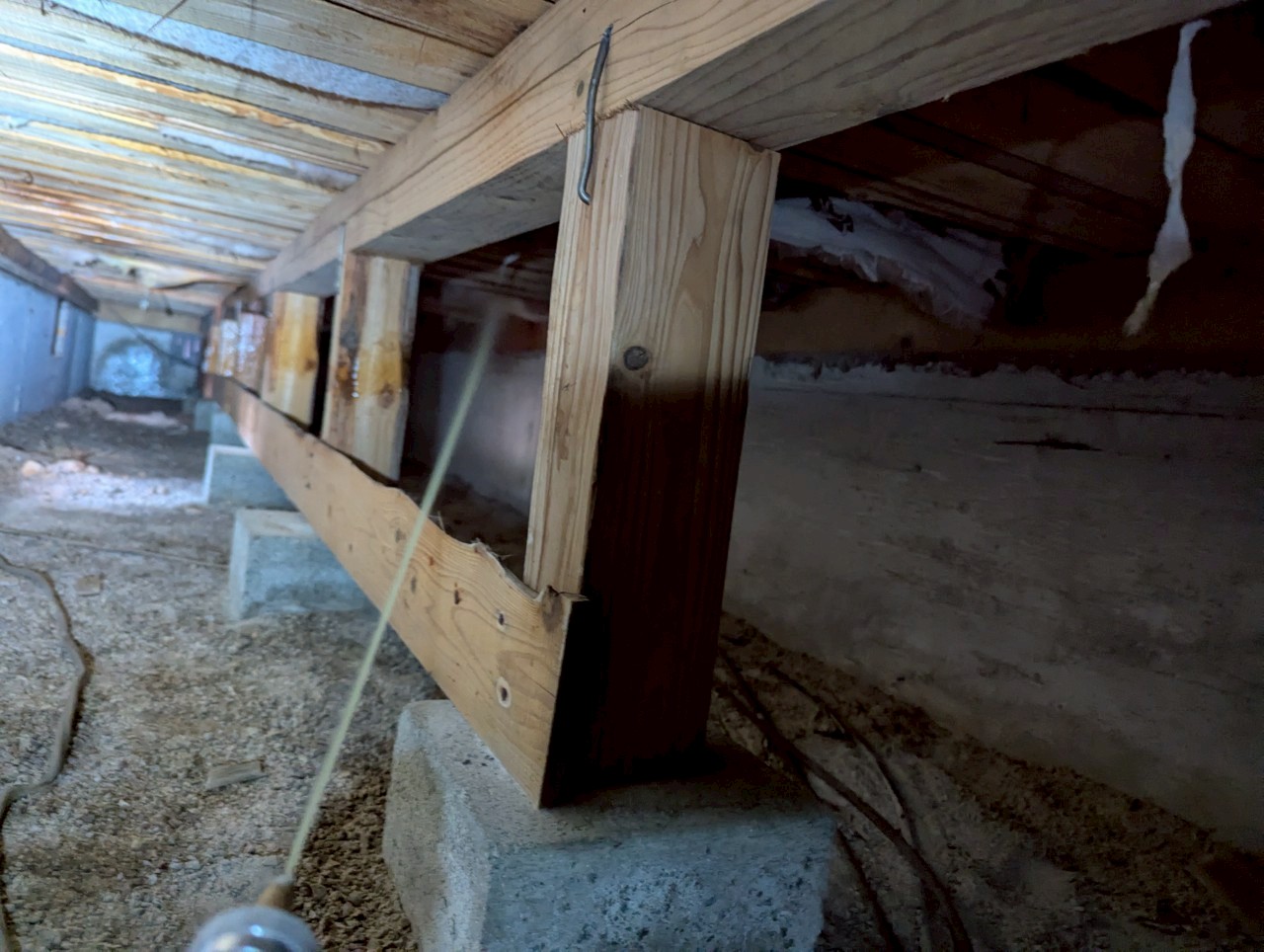 調査の結果、床下の大引きや束柱にシロアリの食害と蟻道が多数確認され、早急な駆除が必要と判断いたしました。