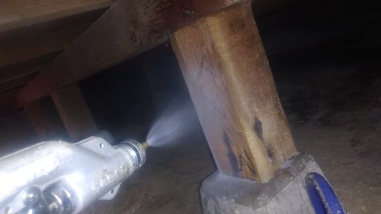 被害木材には穿孔注入で薬剤を深部まで届かせ、床下全域に駆除剤・防カビ剤を徹底散布しました。