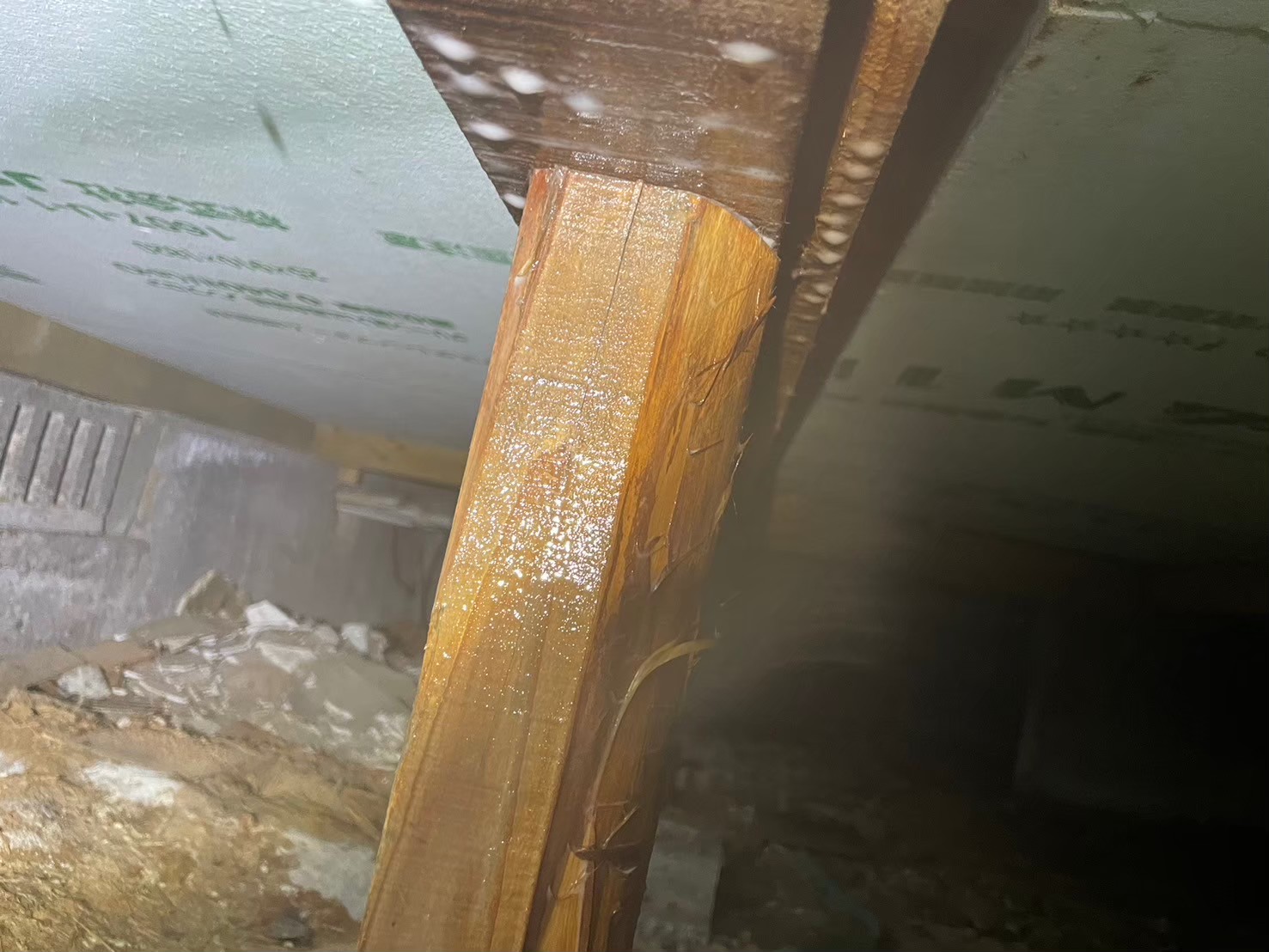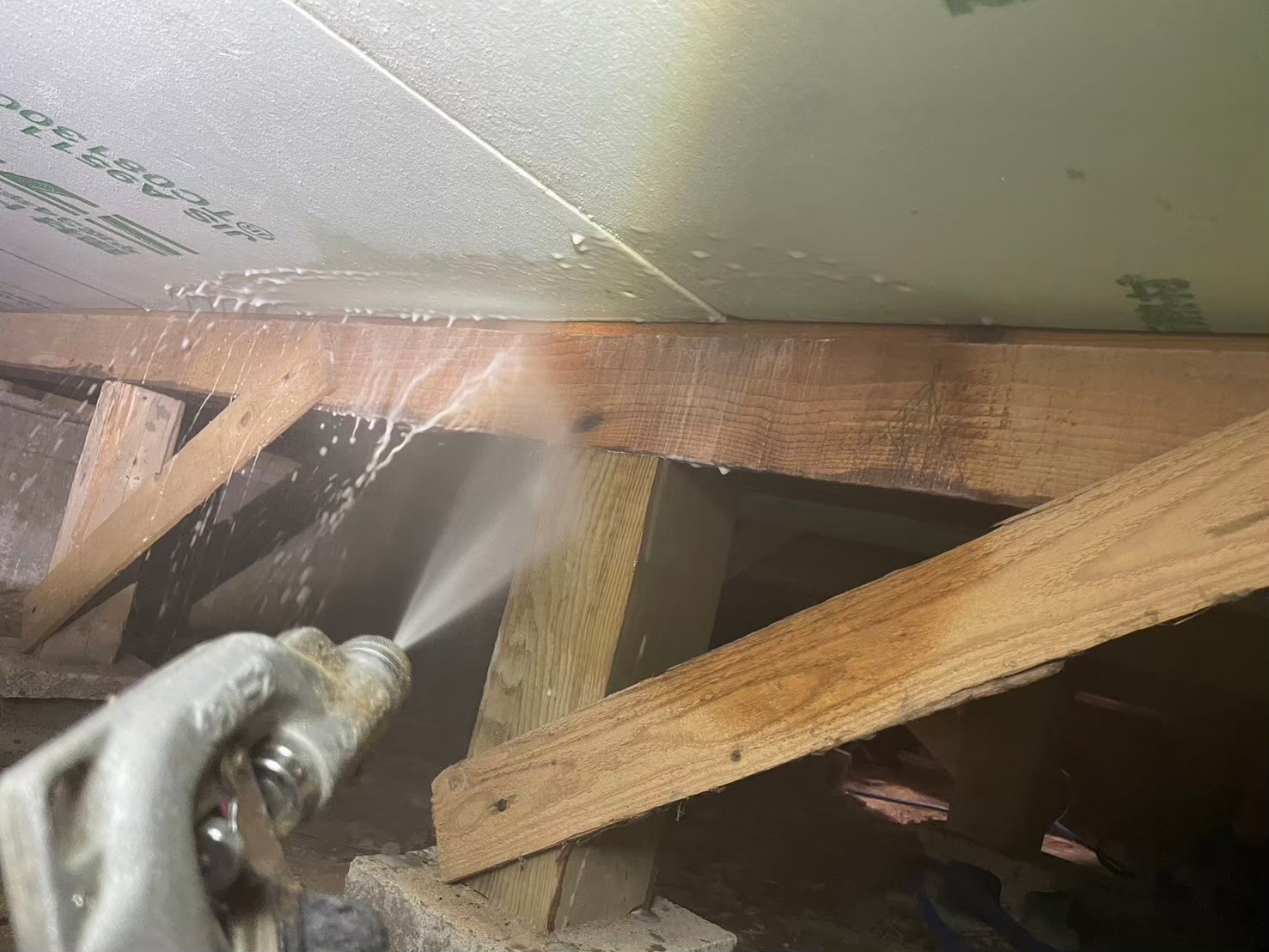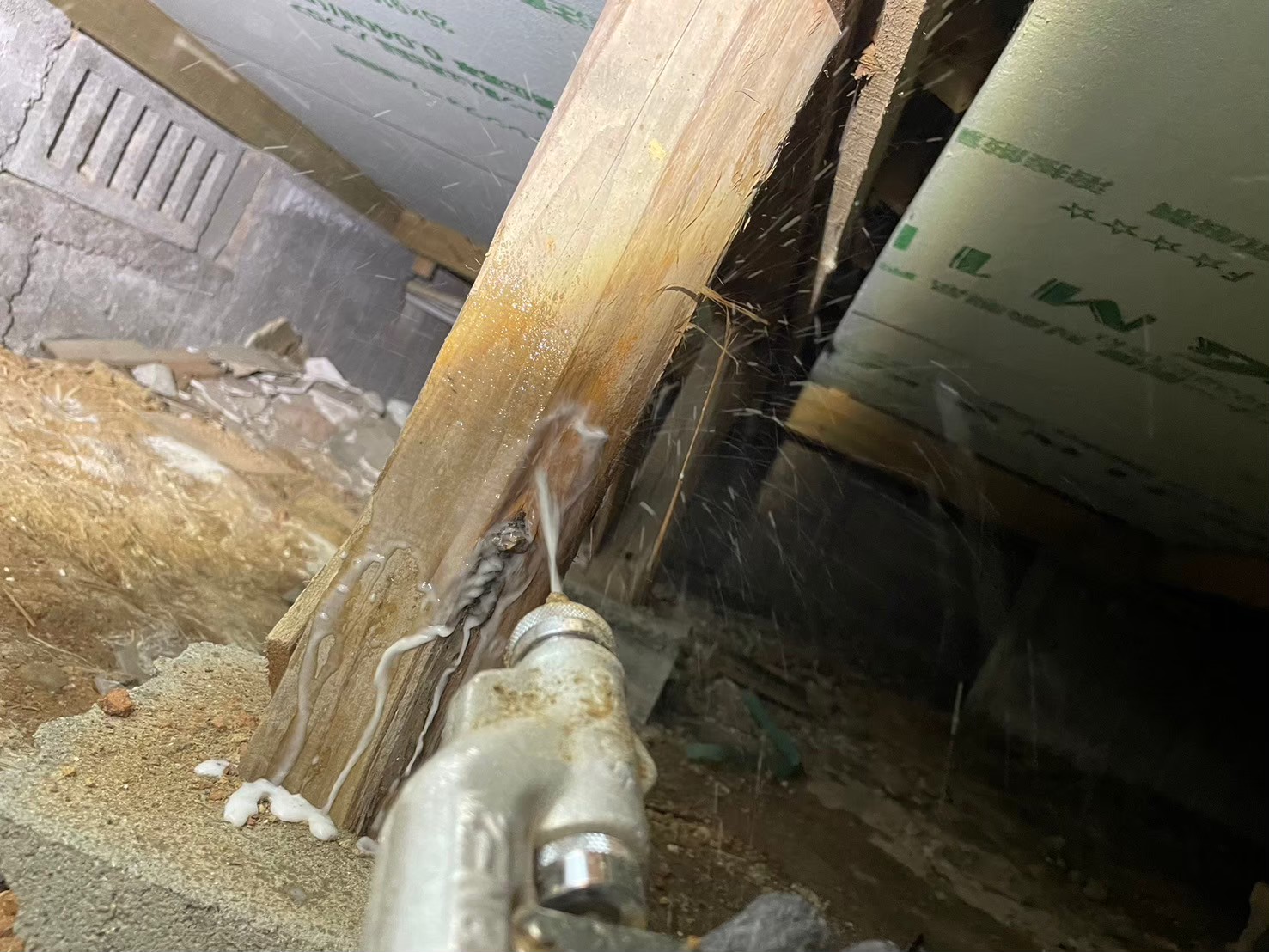 被害木材には穿孔注入で薬剤を深部まで届かせ、床下全域に駆除剤・防カビ剤を徹底散布しました。