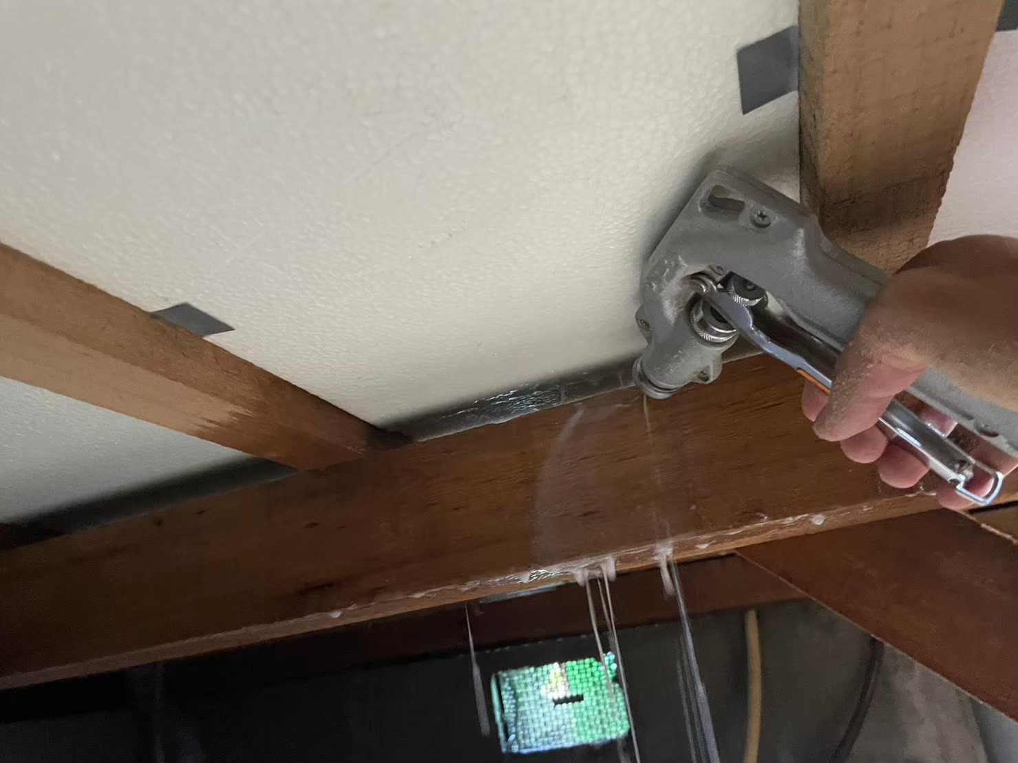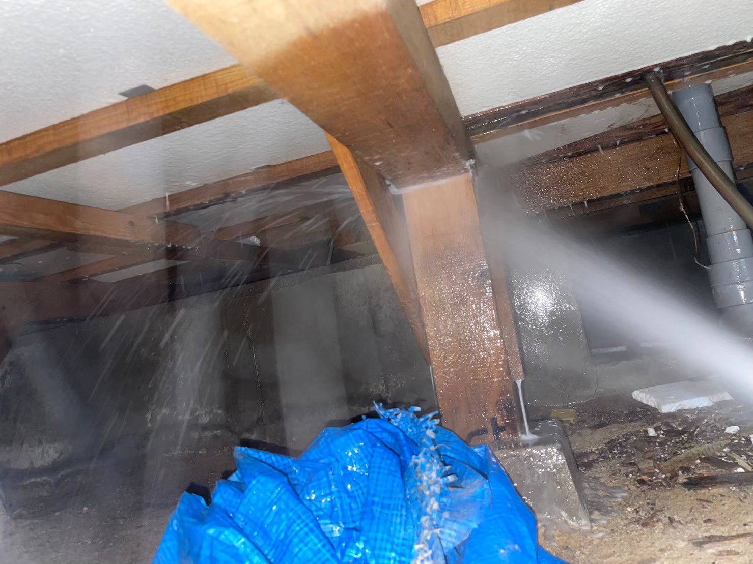 今回も床下調査で広範囲の食害が確認されました。被害木材には穿孔注入で薬剤を深部まで届かせ、床下全域に駆除剤・防カビ剤を徹底散布。