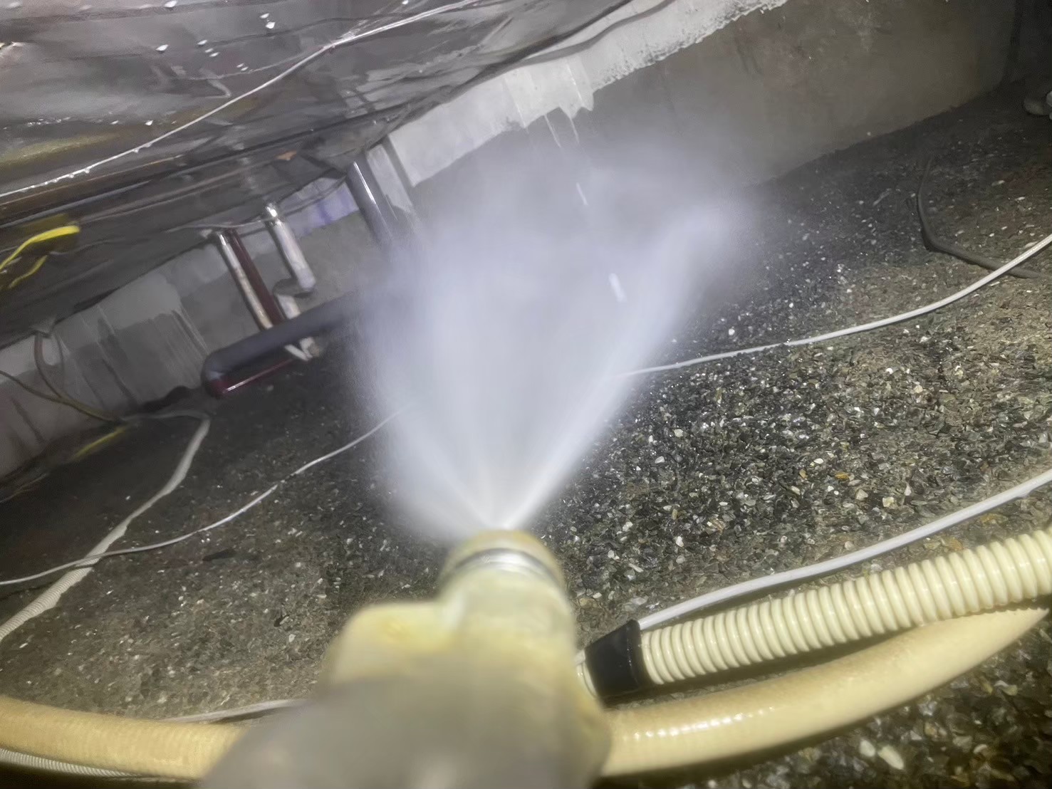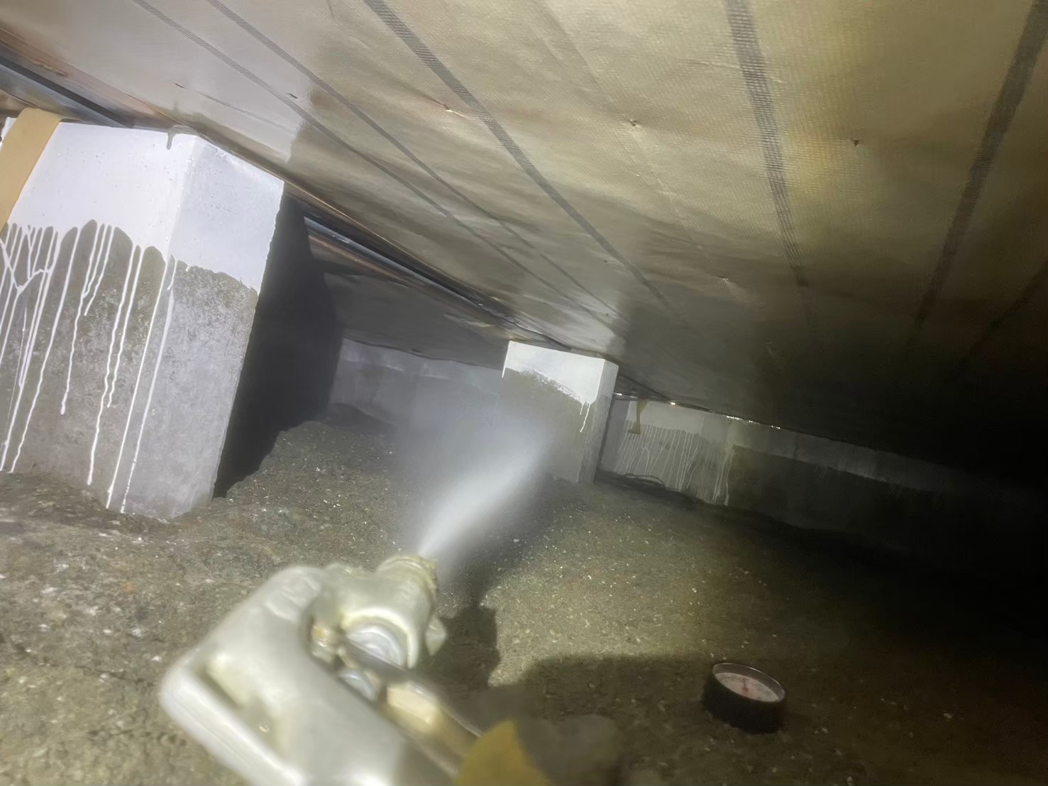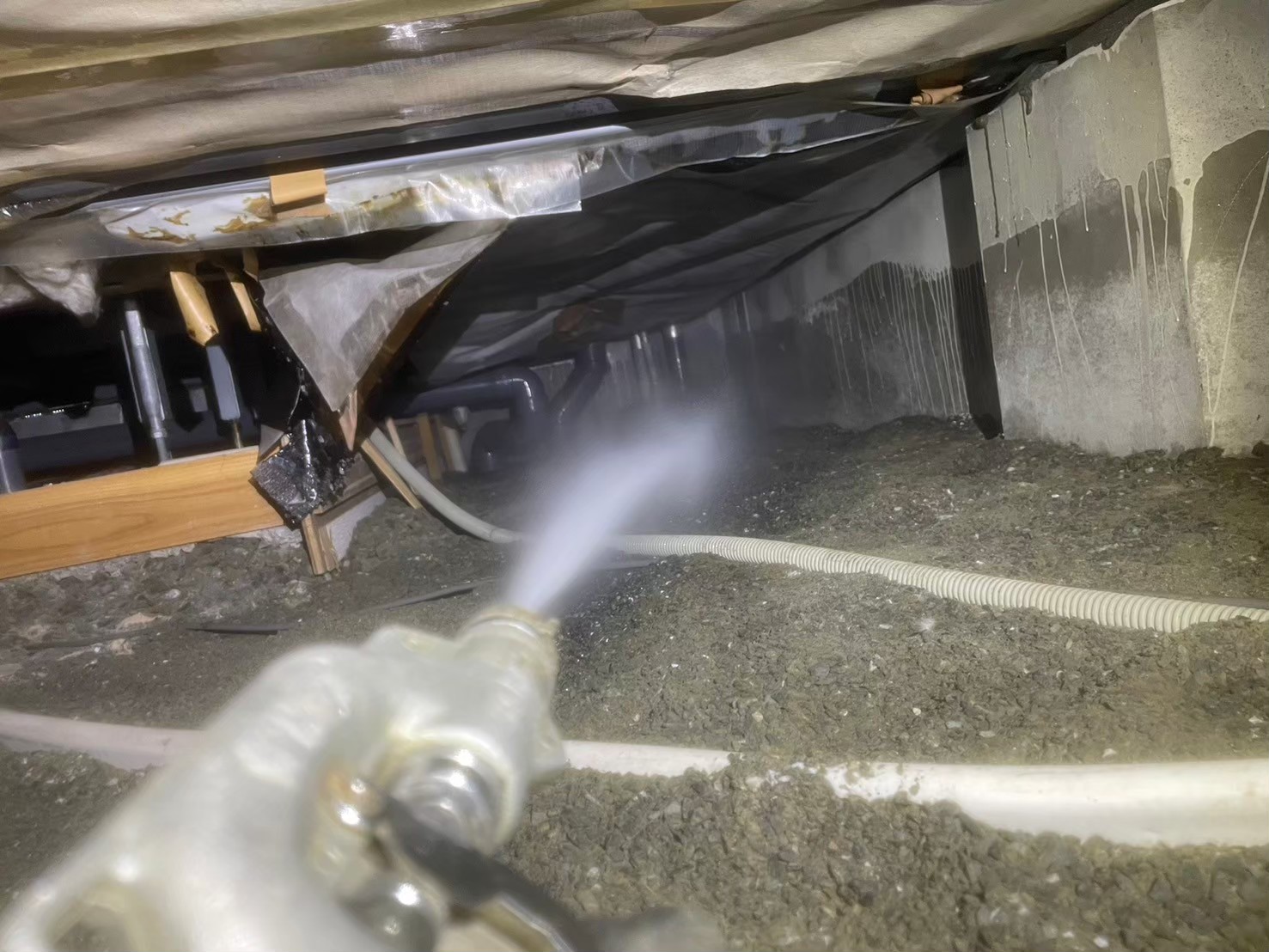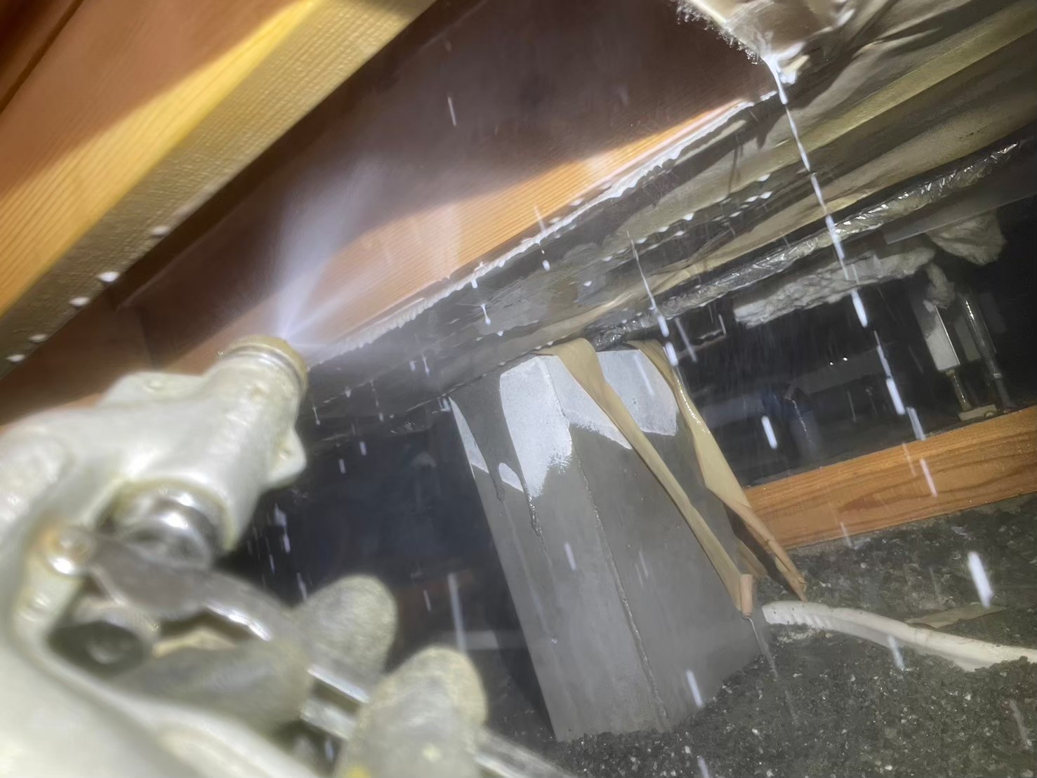 床下調査では廊下下を中心に食害が進行しており、被害木材には穿孔注入で薬剤を深部まで届かせ、床下全域に駆除剤・防カビ剤を徹底散布しました。