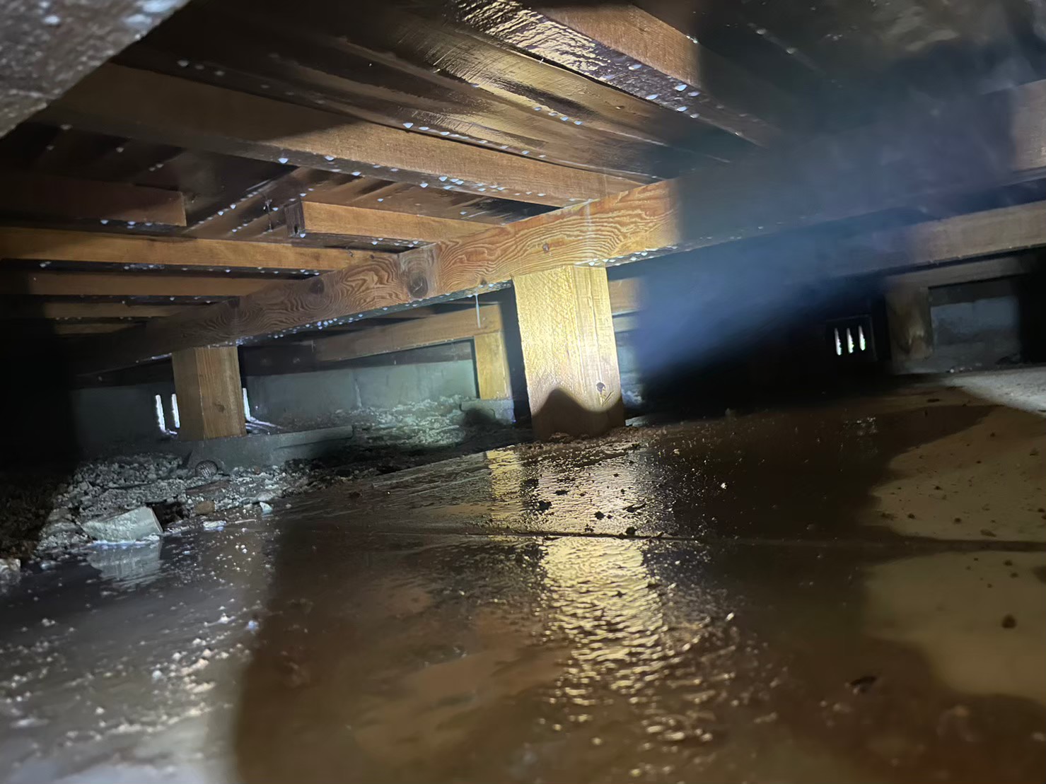 調査の結果、床下の土台から窓枠にかけてシロアリの食害と蟻道が広範囲で確認され、木材内部まで被害が進行していたため、穿孔注入処理を含めた早急な駆除が必要と判断いたしました。