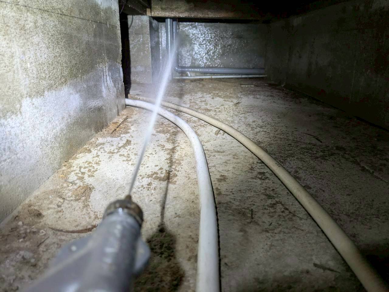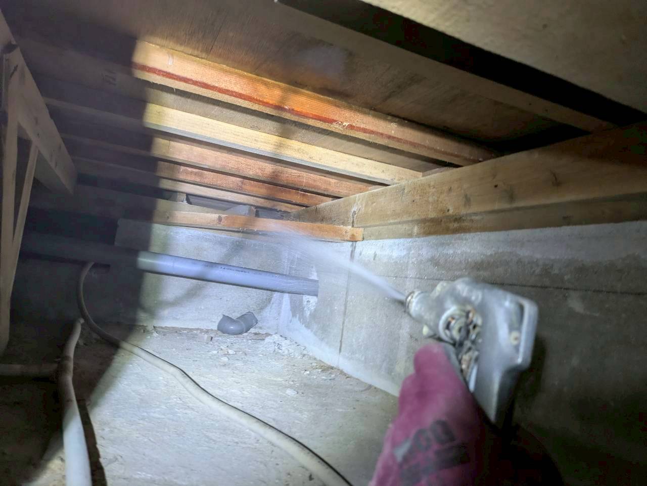 床下調査では広範囲の食害が確認され、穿孔注入処理で薬剤を木材深部まで届かせ、床下全域に駆除剤・防カビ剤を徹底散布しました。