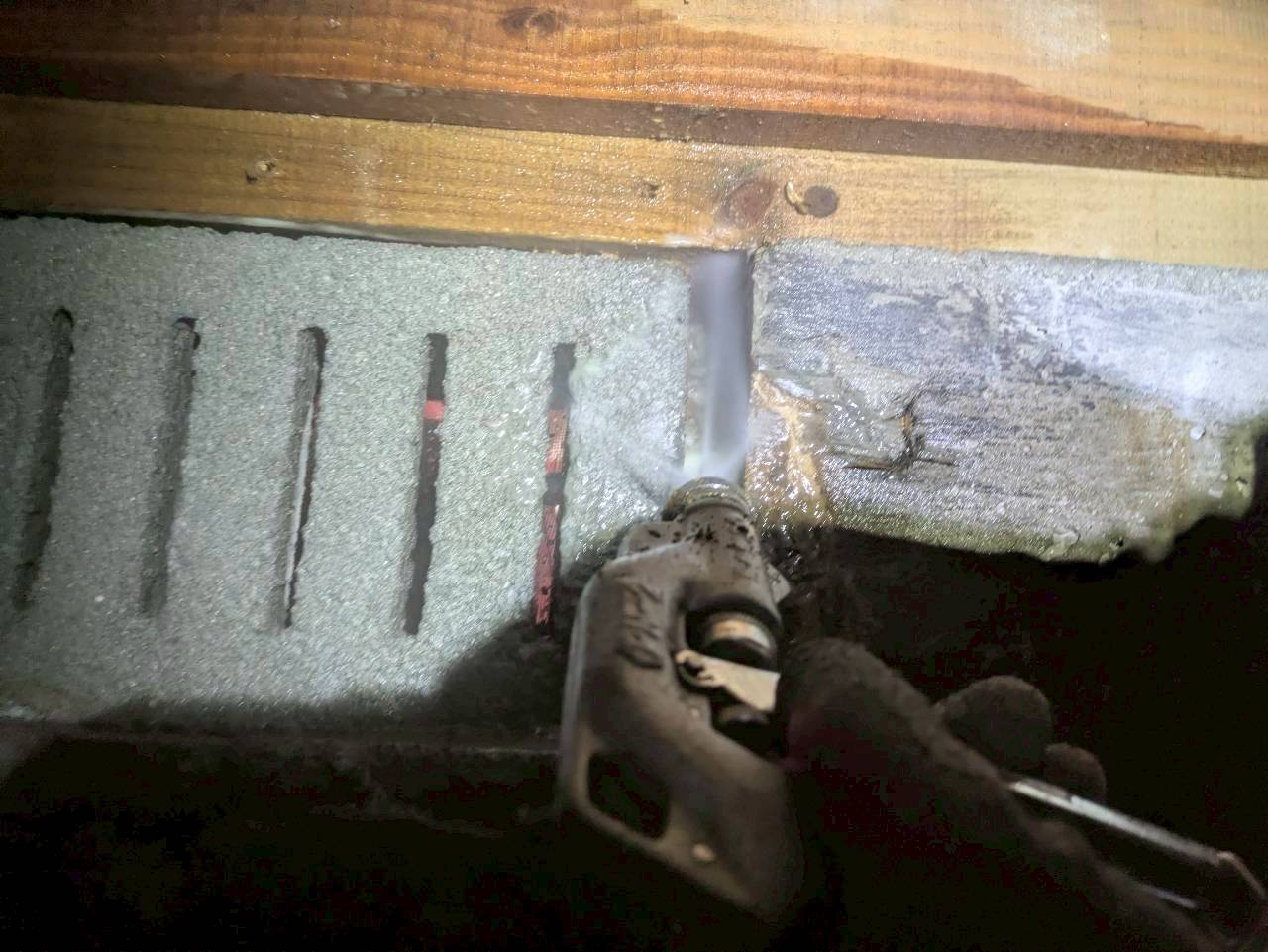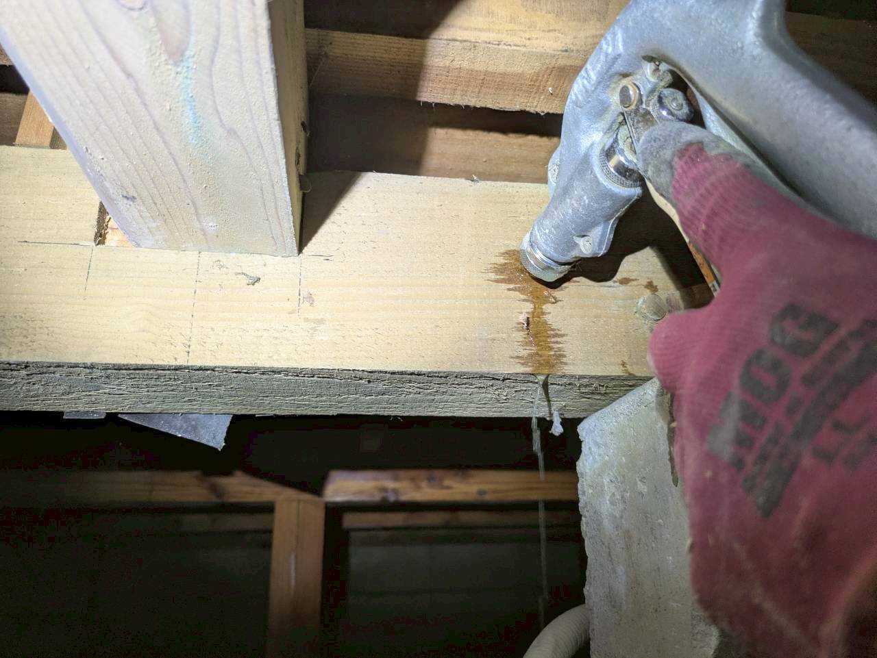 調査では窓枠から床下にかけて広範囲に蟻道と食害が確認され、穿孔注入処理で薬剤を木材深部まで届かせ、床下全域に駆除剤・防カビ剤を徹底散布しました。
