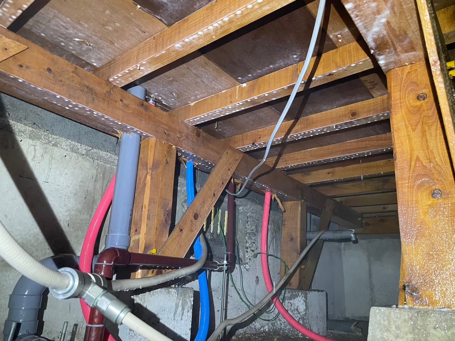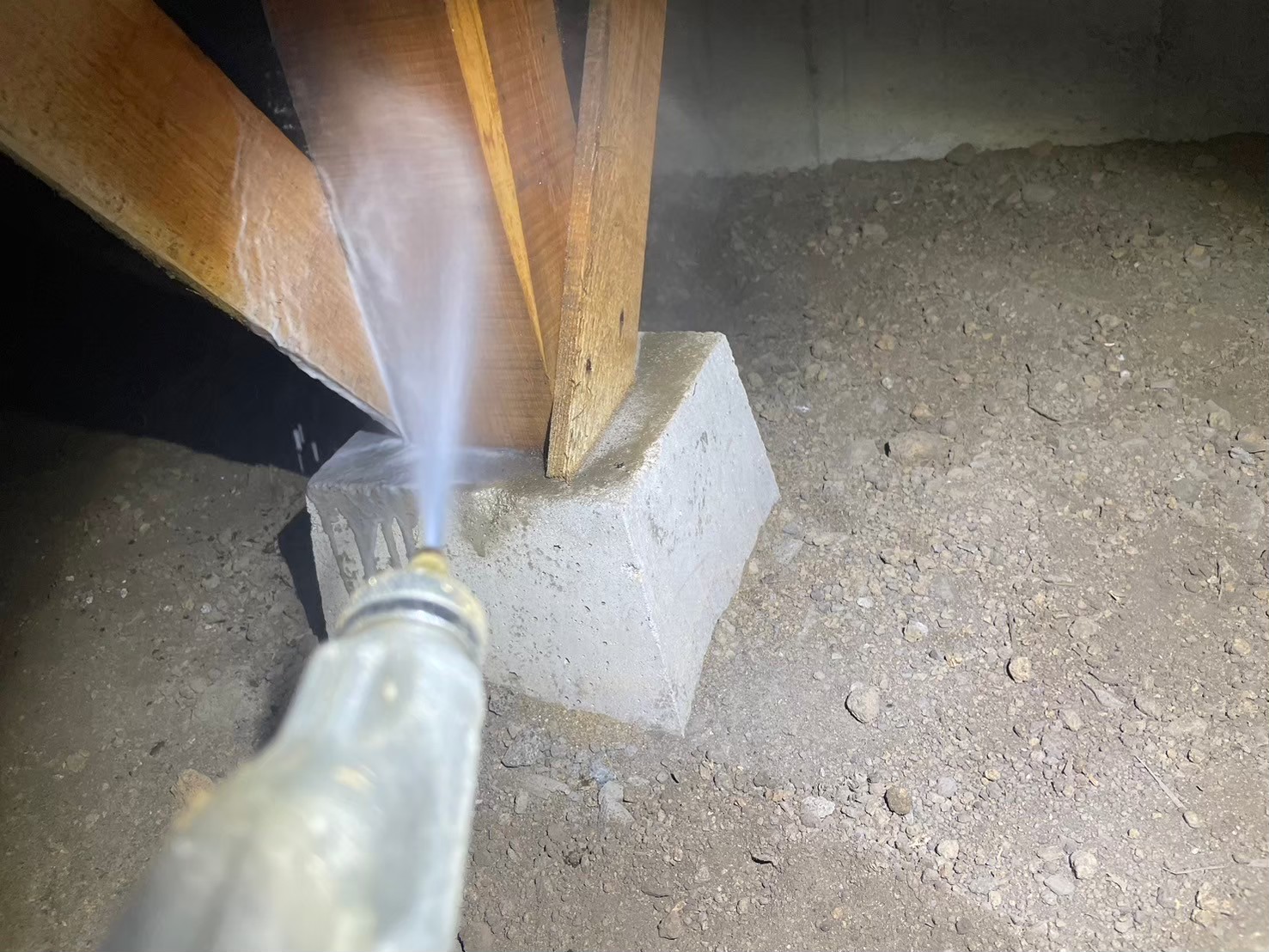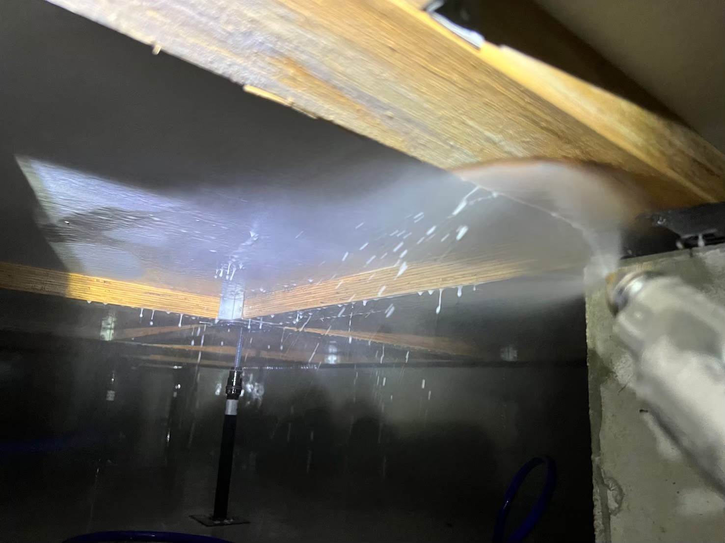 床下全域に駆除剤を徹底散布し、被害が進んだ木材には穿孔注入処理で薬剤を深部まで届かせました。