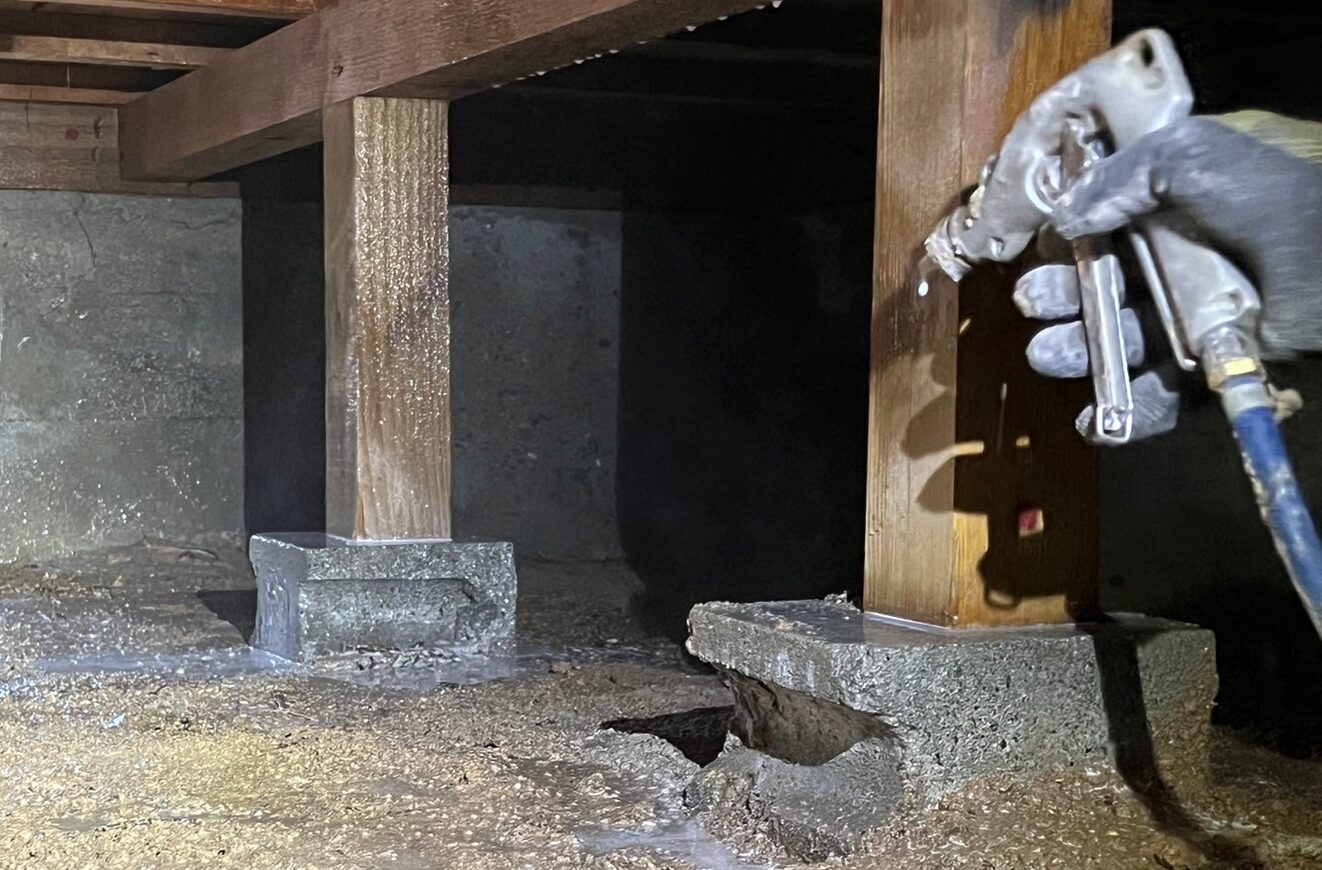 床下全域に駆除剤を徹底散布し、被害が進んだ木材には穿孔注入処理で薬剤を深部まで届かせました。