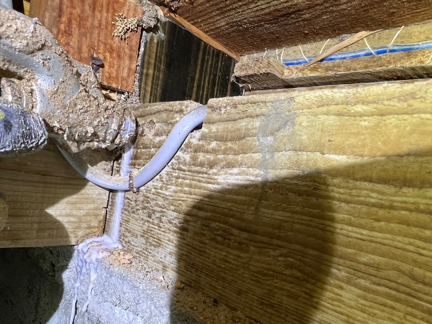 調査の結果、床下の土台・大引きに広範囲のシロアリ食害と蟻道が確認され、壁内部まで被害が進行していたため、床下全域への薬剤散布を含む早急な駆除が必要と判断しました。