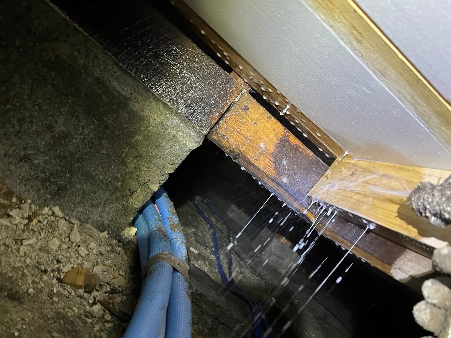 窓周りは雨水や結露で湿気がたまりやすく、シロアリが好む環境になりがちです。床下全域に駆除剤を徹底散布し、被害が進んだ木材には穿孔注入処理で薬剤を深部まで届かせました。
