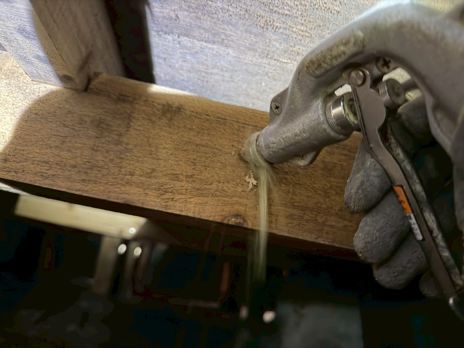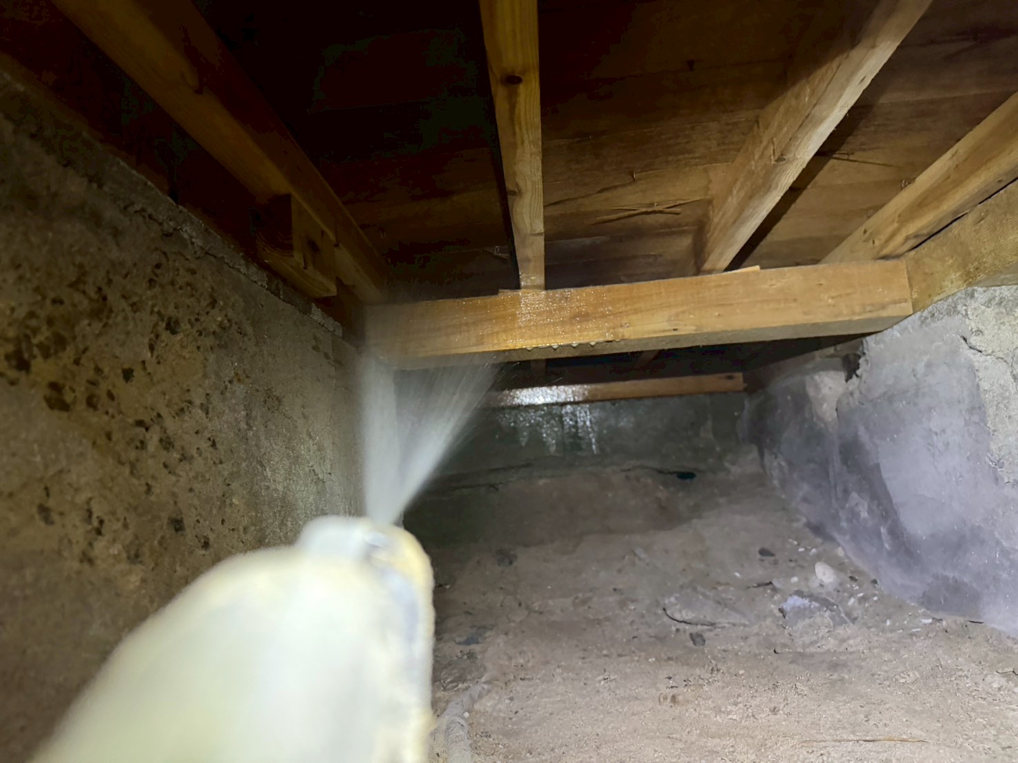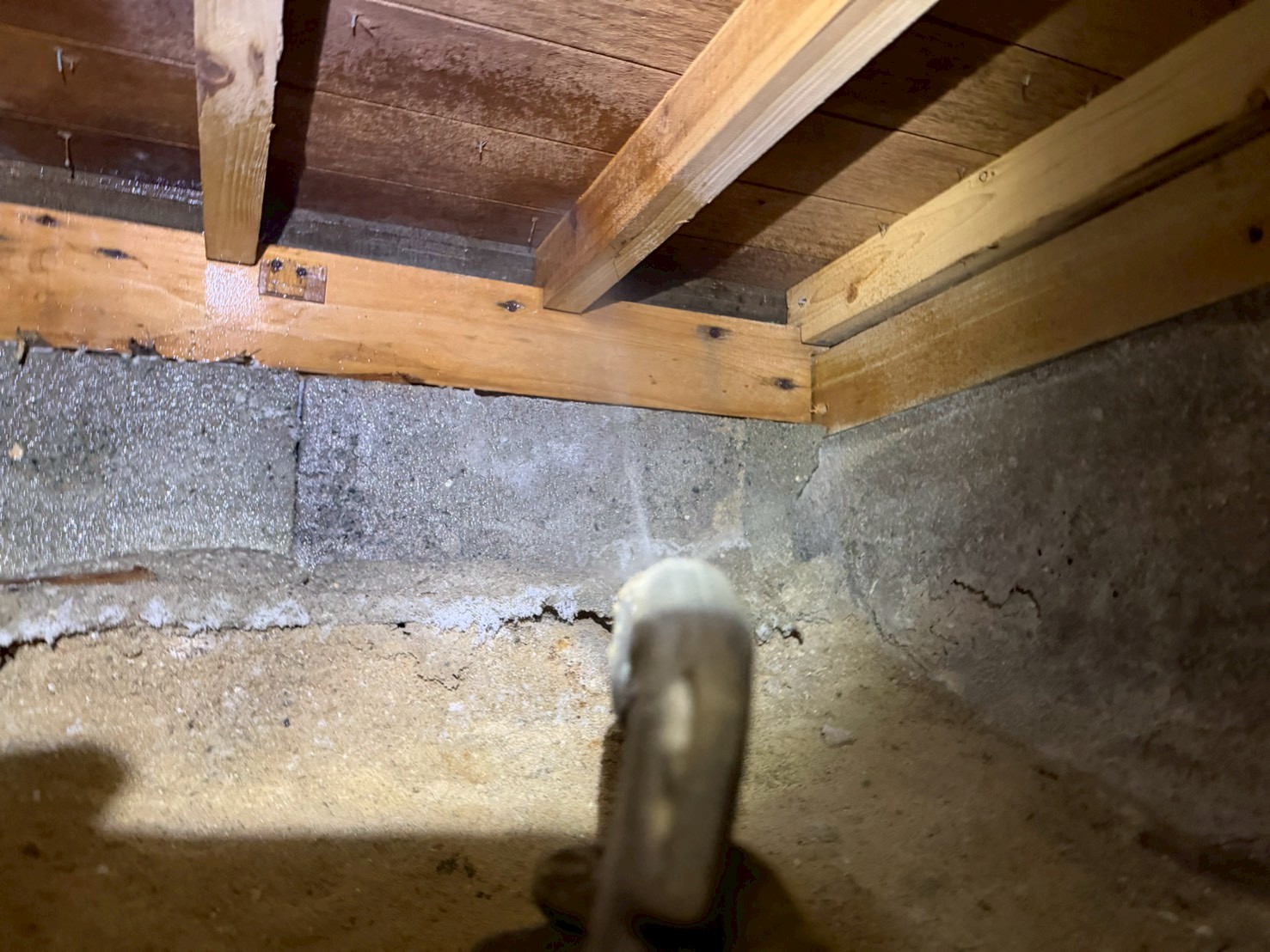 床下全域に駆除剤を徹底散布し、被害が進んだ木材には穿孔注入処理で薬剤を深部まで届かせました。