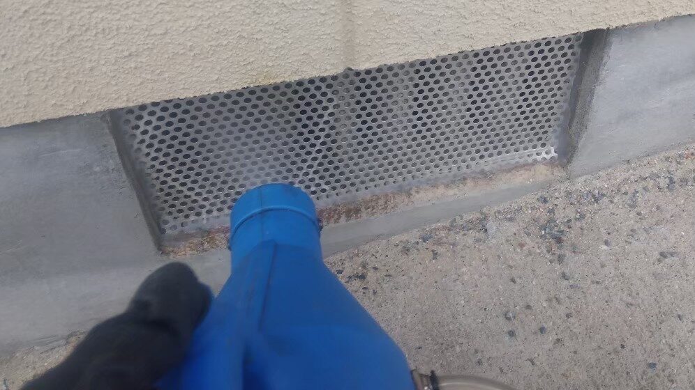 施工では、まず夕方の活動時間帯に追い出し作業を行い、完全に出たことを確認した上で、侵入口となっていた軒天と換気口を専用メッシュで封鎖しました。外壁の黒い汚れはコウモリの油分とフンが混じったもので、専用洗浄剤で丁寧に除去しています。