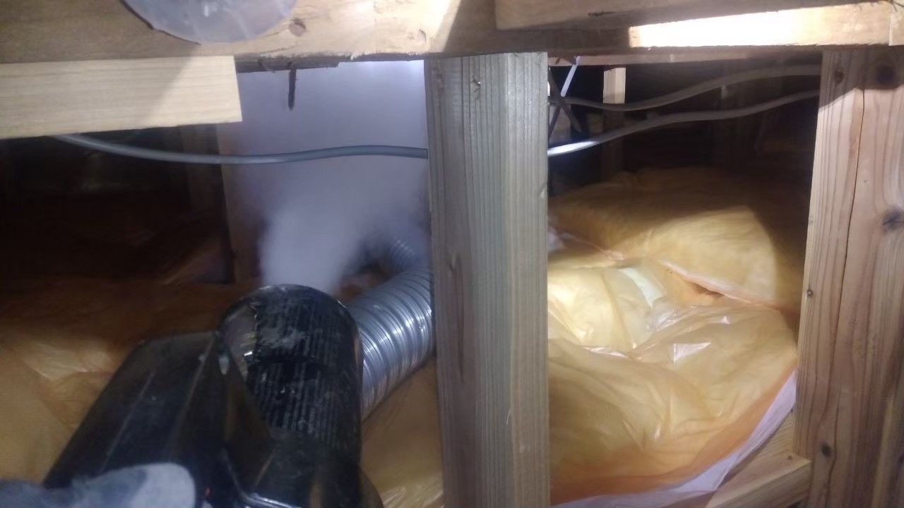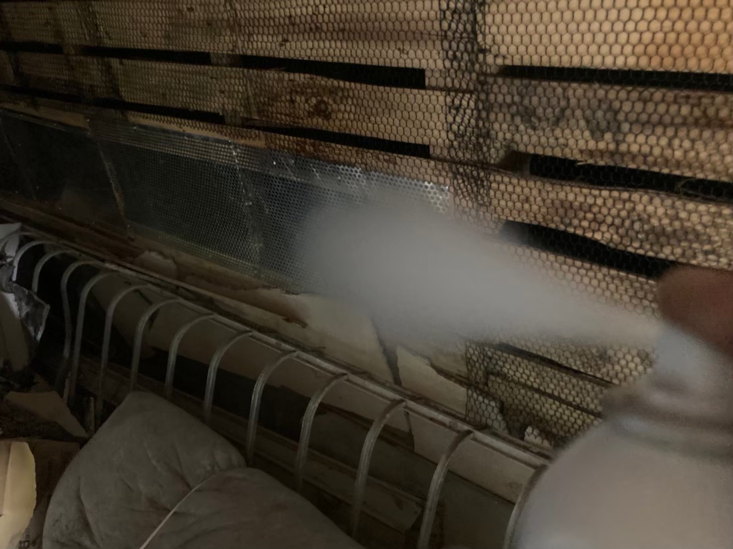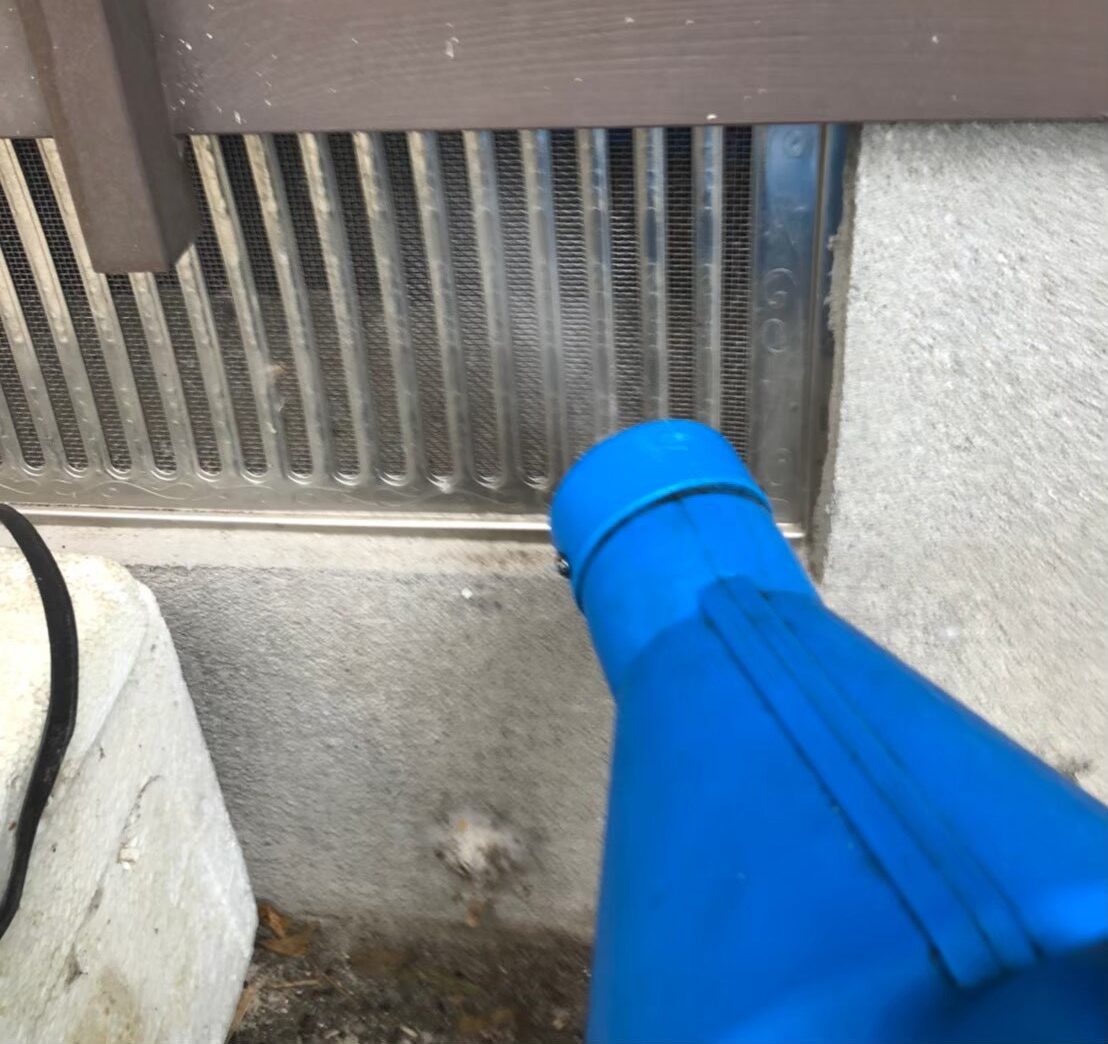作業では、まず既に生息していたシロアリを専用薬剤で徹底的に駆除し、その後、床下全体に防除剤を散布しました。特に被害が大きかった柱部分には穿孔処理を行い、内部まで薬剤が浸透するよう注入しています。