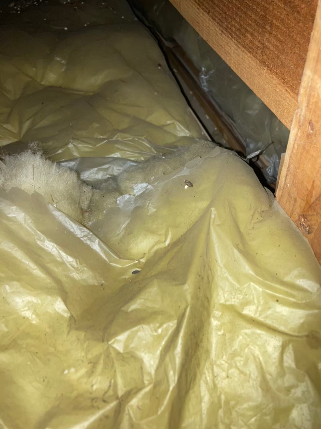 調査の結果、テンの侵入が確認され、断熱材の荒らし・糞尿汚染・天井板の損傷が複数箇所に及んでいる状態でした。屋根裏には強い臭気も発生しており、早急な駆除と修復が必要な状況でした。