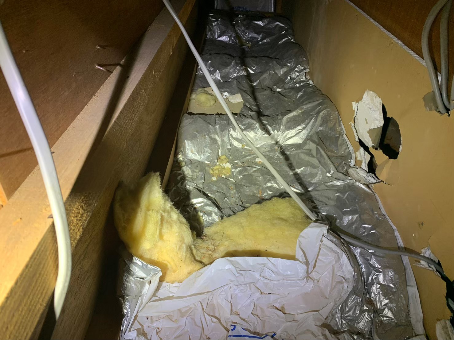 現地調査の結果、アライグマの侵入を確認。屋根裏の断熱材が荒らされ、糞尿の蓄積と悪臭が広がっている状況でした。放置すると天井板の腐食やダニ・ノミの発生にもつながる危険な状態でした。