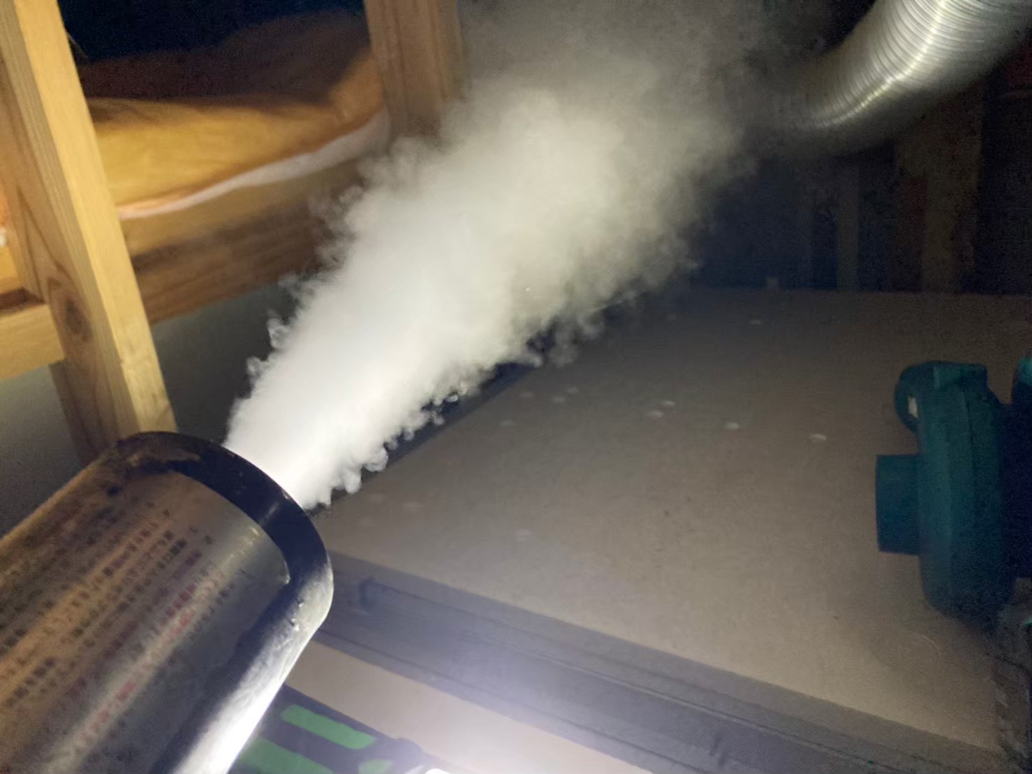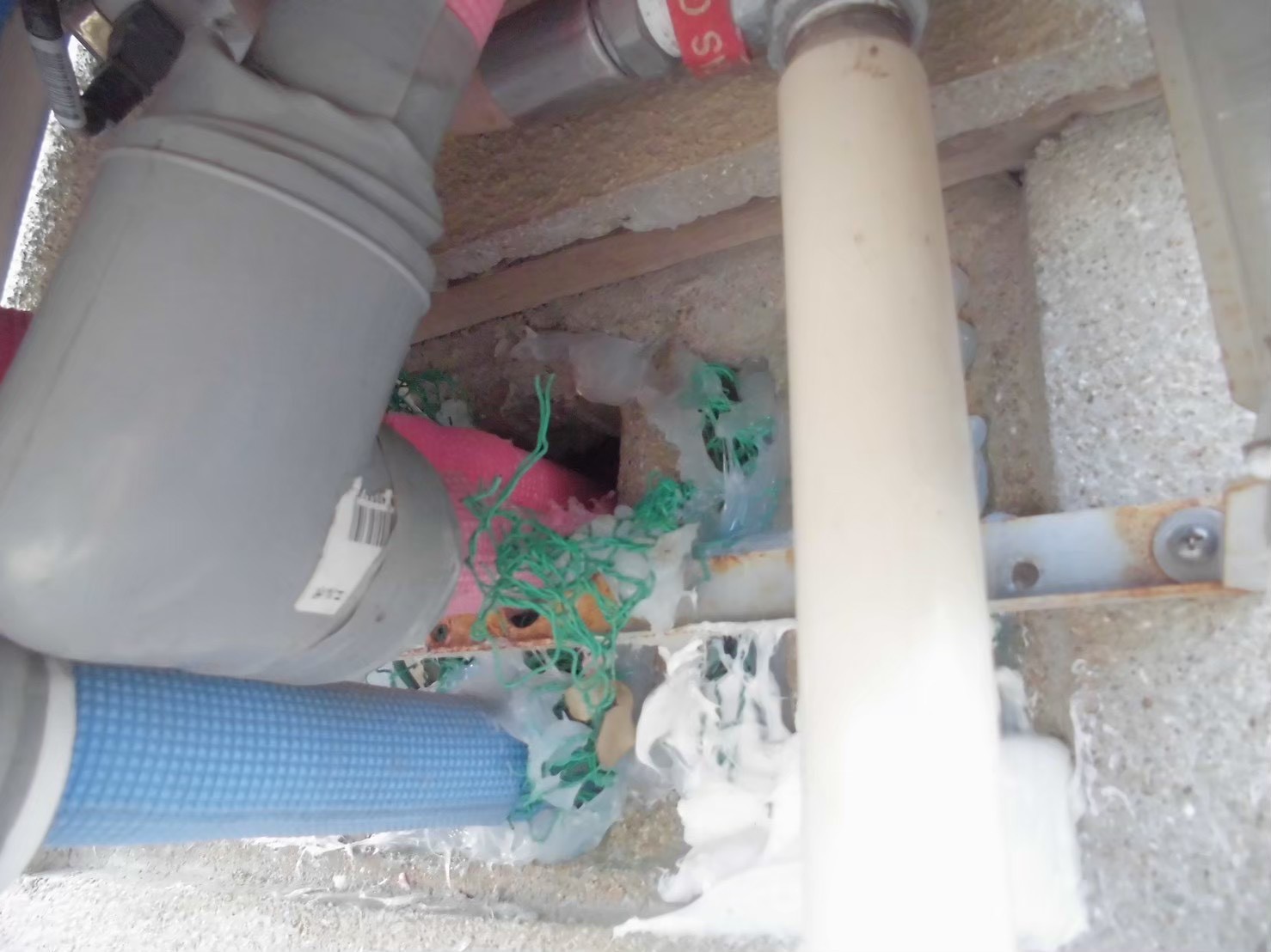 - お客様より「天井裏で動物の走り回る音がする」「深夜にガタガタ音がして眠れない」とのご相談をいただきました。調査を行ったところ、屋根裏にイタチの足跡や糞、断熱材の破損が見つかりました。さらに、配線まわりに齧られた痕跡もあり、火災リスクも高い状況でした。