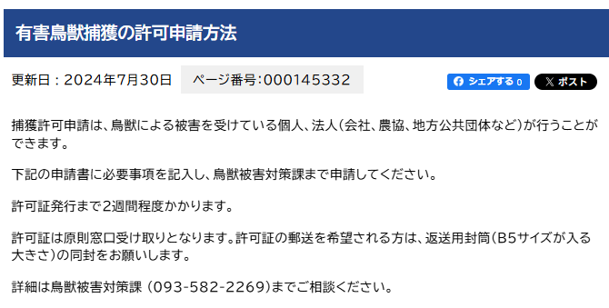 - 都道府県知事または市町村長から「有害鳥獣捕獲許可」を取得すること