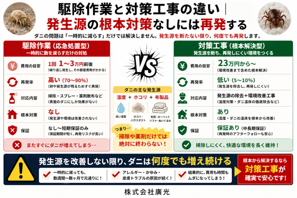 この場合、ダニだけを駆除しても発生源が残る限り再発します。